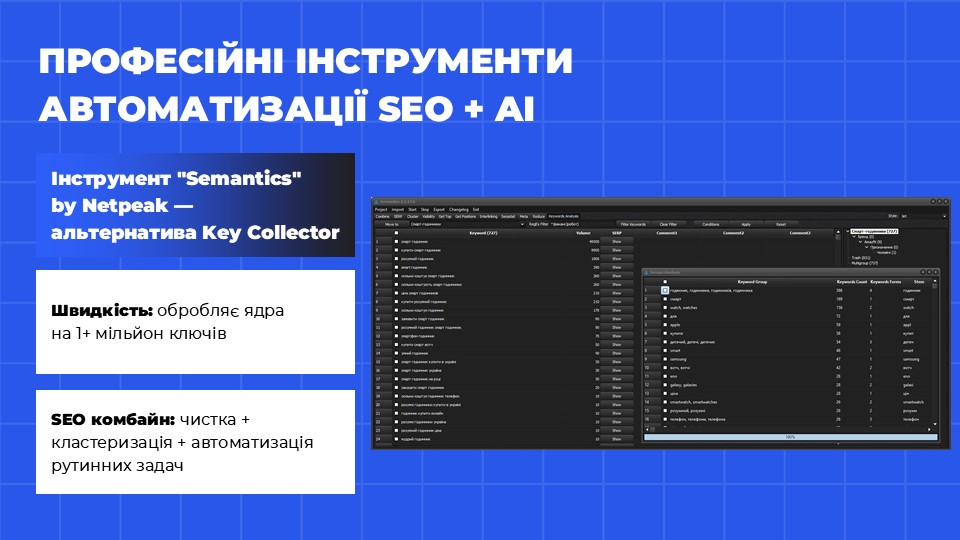 Так само аналіз одного посилання з 2-4 хвилин скоротився до 30-60 секунд. На об’ємі в кілька тисяч посилань економія 75% часу дуже допомогла скоротити трудовитрати. В результаті загалом вдалося зекономити майже 40% часу. Відтак штучний інтелект відіграє роль і фільтра і каталізатора. Проте фінальне рішення завжди має лишатися за людиною, яка активно залучає до роботи АІ. Скажімо в Netpeak є такий інструмент Semantics, що побудований із застосуванням АІ. Він дозволяє кластеризувати і працювати з мільйонною семантикою.