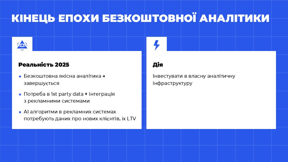 Основою конкурентної спроможності в сучасному світі є цифрова зрілість бізнесу (Digital maturity). Реальність така, що період безкоштовної якісної аналітики завершується, й виникає потреба в збиранні первинної інформації. Водночас найскладніший виклик – це передача зібраних даних в різного роду системи. Проте вже є відповідні працюючі рішення. Також АІ алгоритми в рекламних системах потребують даних про нових клієнтів та їх LTV.