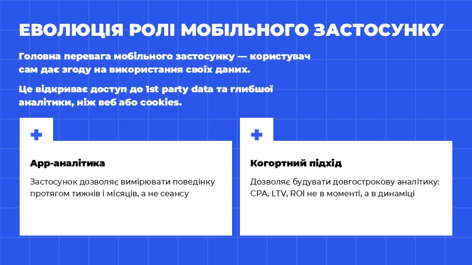 До того ж лишаються доступними певні безкоштовні сервіси на кшталт Google Analytics 4 або їхнє рішення на платформі Firebase. Проте такі рішення добре працюють тільки з Google інструментами. Що не завжди підходить мультиканальним ритейлерам. Тому доводится звертатися д платних інструментів, наприклад, AppsFlyer, що дозволяє аналізувати дані не тут і зараз, а на певному відрізку часу. Це допомагає зрозуміти, як з часом змінюються дані та як відповідно, з часом можна змінювати рішення.