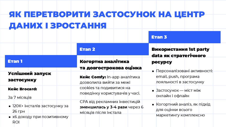 Цей процес умовно можна розділити на три етапи. Спочатку – запуск додатку, який у випадку компанії Brocard за сім місяців платного промоушену забезпечив ритейлеру більше 120 000 інсталяцій та підвищив дохід ушестеро. Але найголовніше, що компанія отримала доступ до First party data й може далі працювати з цією інформацією.