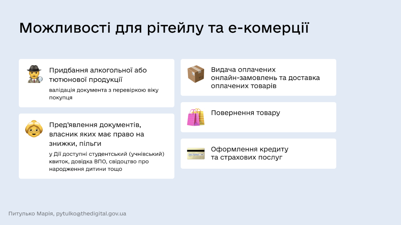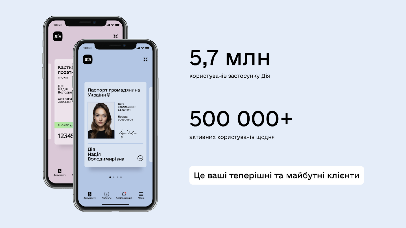 Застосунок Дія дає можливість отримувати копії цифрових документів, а також перевіряти дійсність цифрових документів, вік чи ПІБ користувача. Просто, зручно та без паперових документів або їхніх копій. Якщо ваша організація робить ксерокопії документів або перевіряє особу, то інтеграція з Дія зробить ваші процеси зручнішими, а клієнти не будуть хвилюватися про забуті вдома документи.