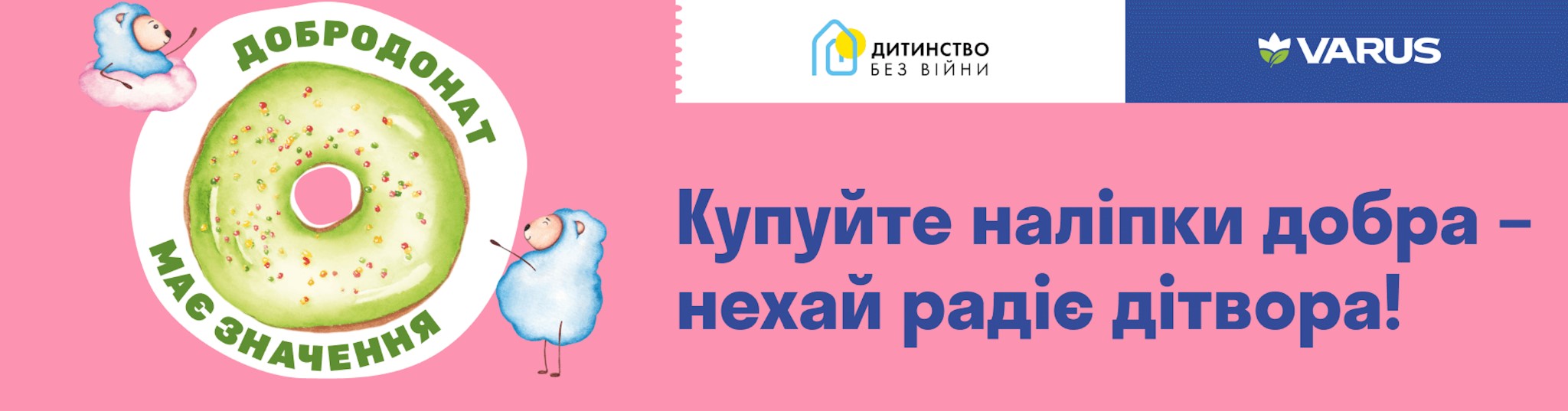 Окрім цього, до 25 жовтня 2023 року у мережі Varus проходить додаткова благодійна акція «Добродонат», де можна отримати миттєві подарунки, купуючи благодійну наліпку. Тож ви можете не тільки задонатити на добру справу, але й маєте шанс виграти солодкі донати власного виробництва Varus, одну з м’якеньких подушок-донат або пакет «КІНО» на 3 місяці від партнера акції SWEET.TV. Весь прибуток від продажу наліпок «Добродонат» буде переданий на проект «Дитинство без війни».