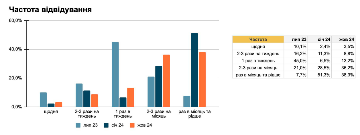 Проводили дослідження три рази: в липні 2023-го, у січні та жовтні 2024. Загалом було опитано понад 1000 респондентів (офлайн та онлайн), окремо проводили опитування сімейної аудиторії (300 сімей загалом).