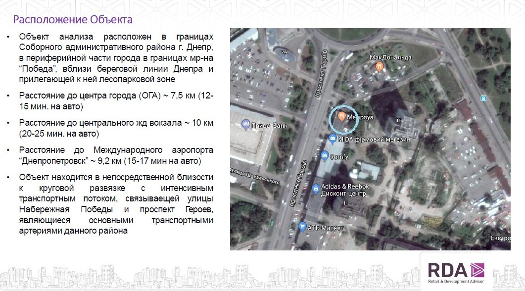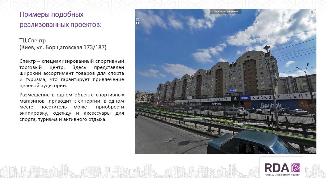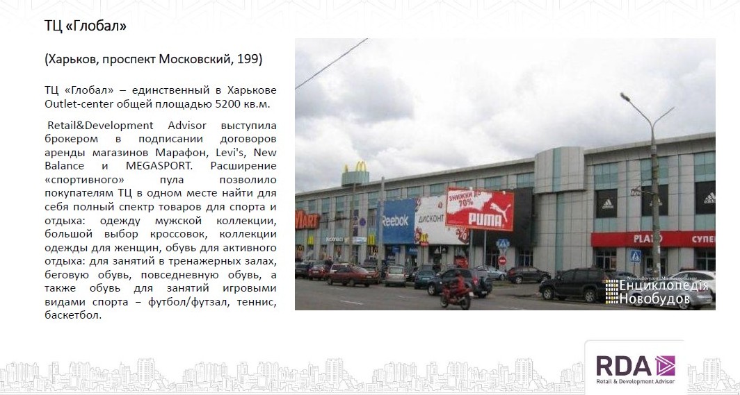У подібній концепції працює ТЦ Глобал в Харкові на Московському проспекті, концепція та пул орендарів якого також формувалися за активної участі Retail & Development Advisor. У спеціалізованому торговому центрі присутні кілька спортивних моно- та мульти-брендових магазинів. За посередництва Retail & Development Advisor в ТЦ з’явилися магазини Мегаспорт, Марафон, New Balance, Levi’s та інші.