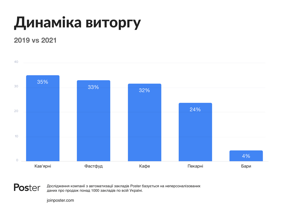 Як повідомляє портал Delo.ua, про це свідчать дані аналізу ринку, проведеного компанією з автоматизації кафе та ресторанів Poster. Найінтенсивнішу динаміку збільшення доходів у 2021 році показали кав’ярні. Порівняно з 2019 роком, їх виручка зросла на 35% (на 33% до 2020 року). Середній чек збільшився на 27% порівняно з часом на початок пандемії коронавірусу (на 12% до 2020 року).