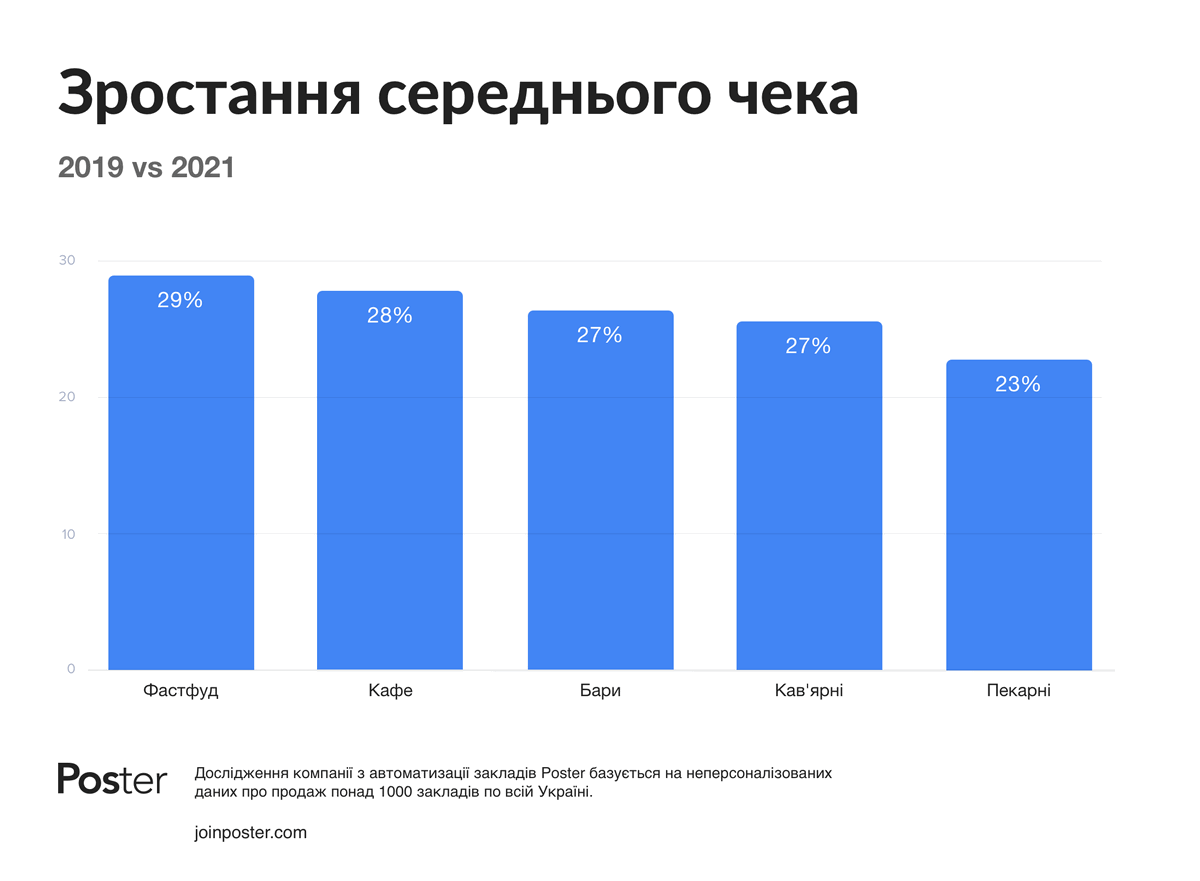Досить великий приріст доходів отримали заклади, що працюють у сегменті фастфуду. Їхня виручка зросла на 33% порівняно з 2019 роком (на 32% до 2020 року), середній чек – на 29% (+11% до 2020 року).