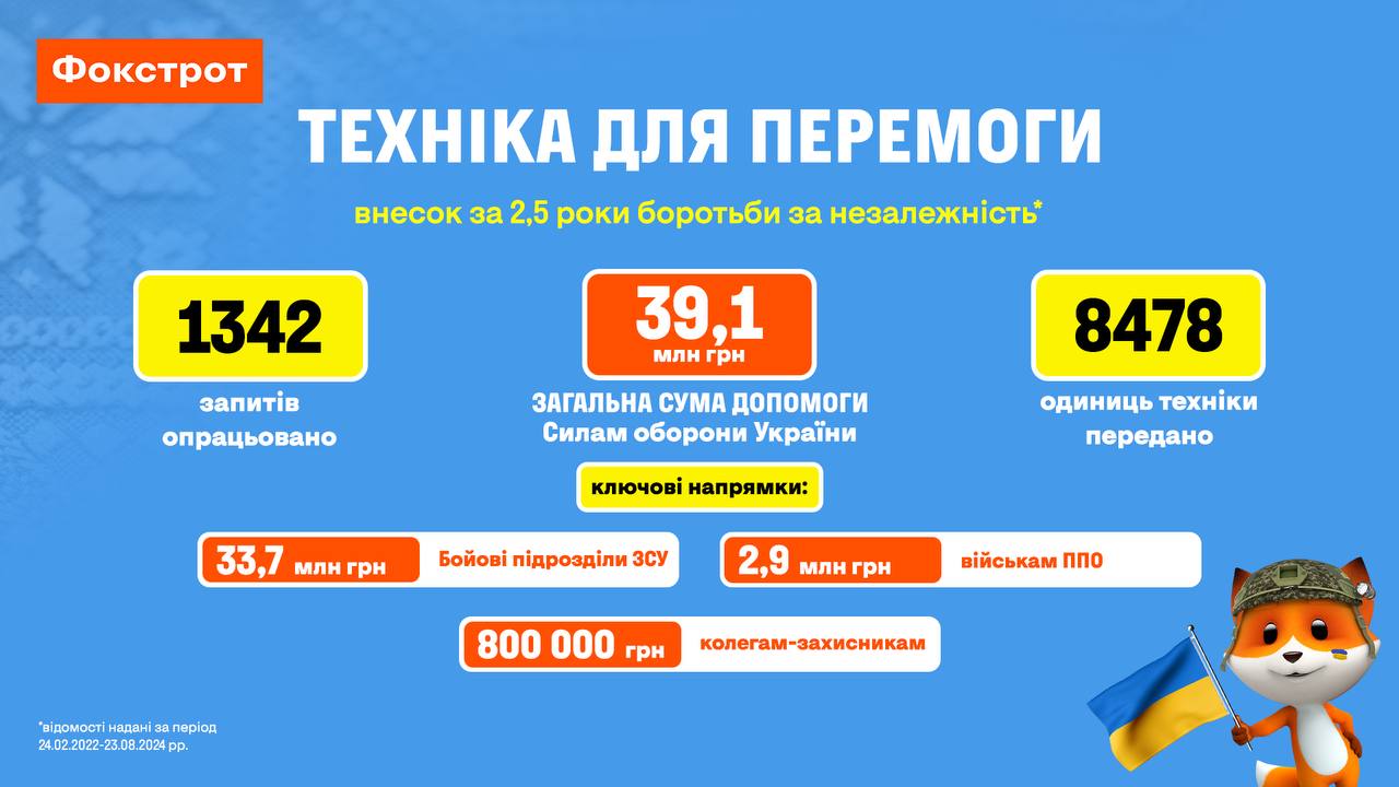 Напередодні 33-ї річниці Незалежності України у корпоративному штабі Фокстрот «Допомога нашим» підбили підсумки роботи протягом 2,5 років з початку повномасштабної війни. За цей час волонтери штабу – співробітники компанії – опрацювали 1342 запити від військових частин ЗСУ, ГУР, ССО, СБУ, Нацполіції, Нацгвардії, підрозділів ДСНС тощо. Сума допомоги технікою сягнула 39,1 мільйона гривень, а кількість виданих гаджетів складає майже 8500.