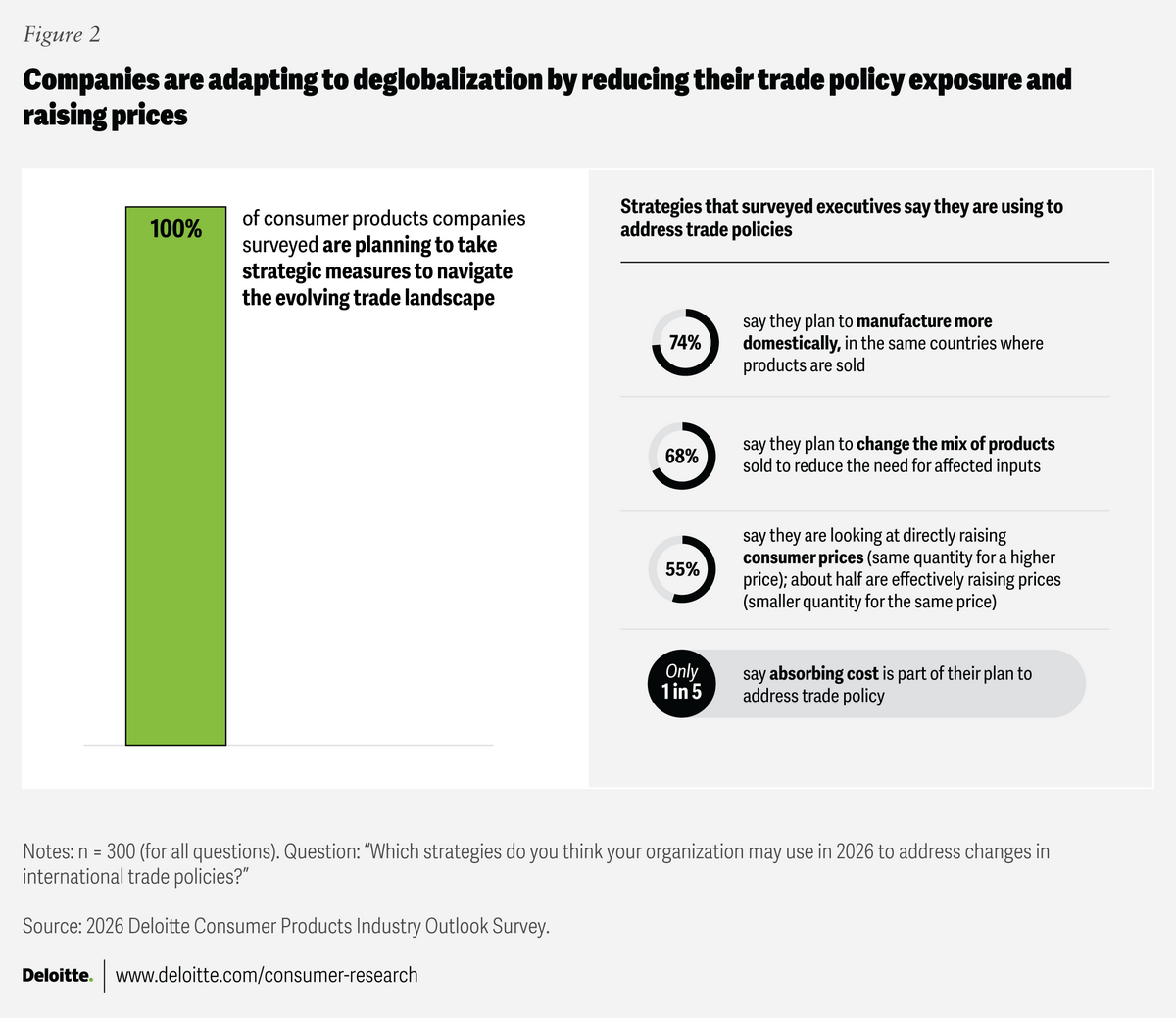 Нині компанії по всьому світу стикаються зі значними демографічними, політичними, екологічними, технологічними та культурними зрушеннями. Ключовими рушійними силами є деглобалізація та штучний інтелект, які, зокрема, стрімко змінюють галузь споживчих товарів. Deloitte підготував дослідження 2026 Consumer Products Industry Global Outlook, виокремивши сім причин для визначення стратегії на наступний рік. Дослідження базується, зокрема, на глобальному опитуванні 300 керівників вищої ланки 100 великих компаній-виробників споживчих товарів у секторах харчових продуктів та напоїв, товарів для дому, а також косметики та засобів особистої гігієни. RAU пропонує ознайомитися з основними тезами та висновками дослідження.