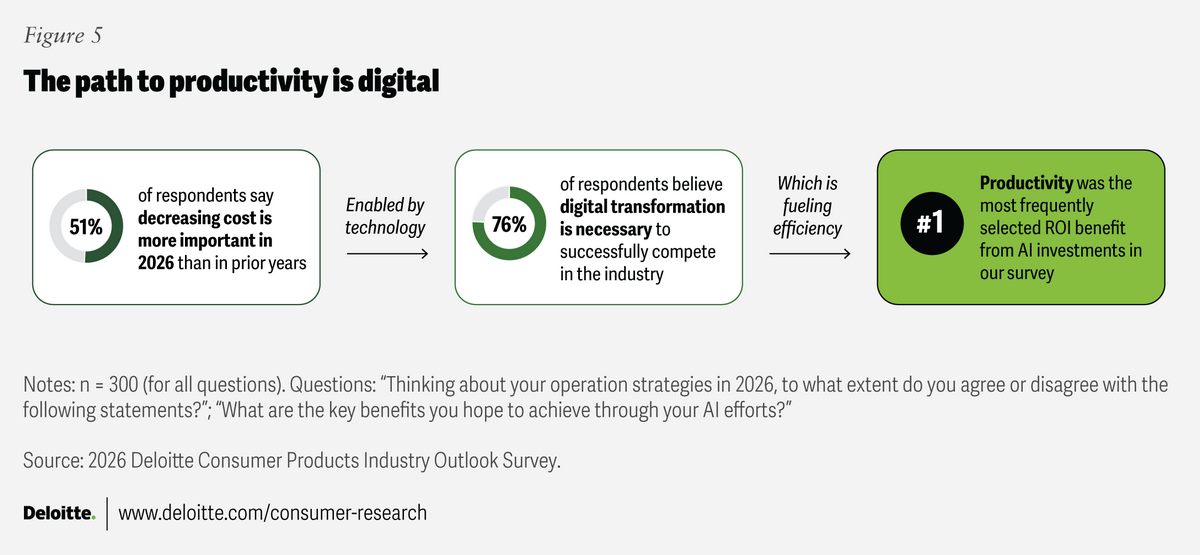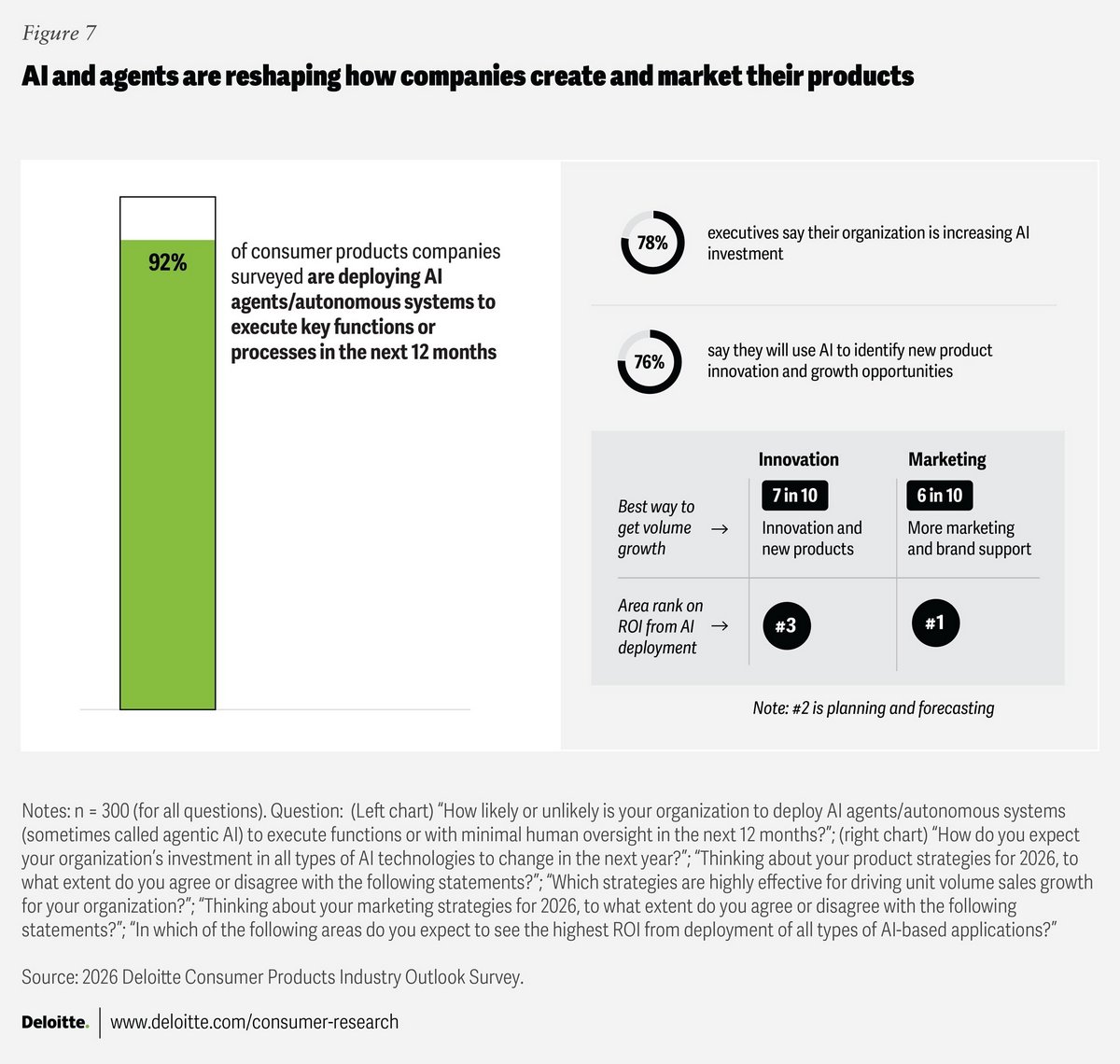 ШІ допомагає компаніям виробляти, а споживачам — купувати. Це змінює правила гри. Для виробників споживчих товарів найперспективнішими варіантами використання ШІ наразі є продуктові інновації та маркетинг. Інвестиції в ШІ допомагають їм створювати більше кращих концепцій продуктів і персоналізований контент за значно менший час, що збільшує їхню рентабельність інвестицій (ROI).