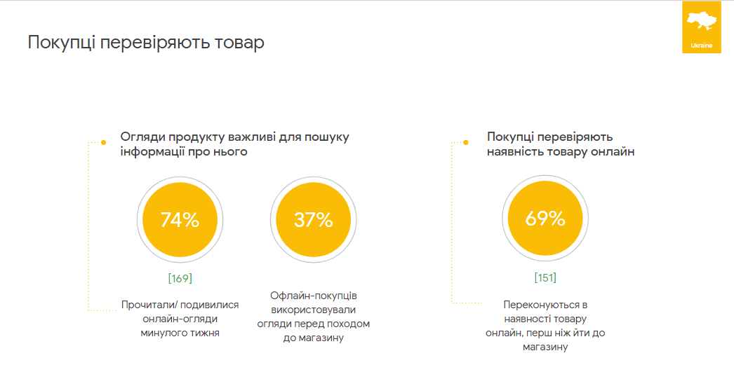 Перегляд оглядів продуктів перед покупкою – ще один важливий момент для українців. Так, 74% респондентів читають або дивляться огляди продукції, що їх цікавить, а 37% офлайн-покупців використовували онлайн-огляди перед відвідуванням магазину. При цьому 69% покупців перевіряли онлайн наявність товару в магазині перед візитом.