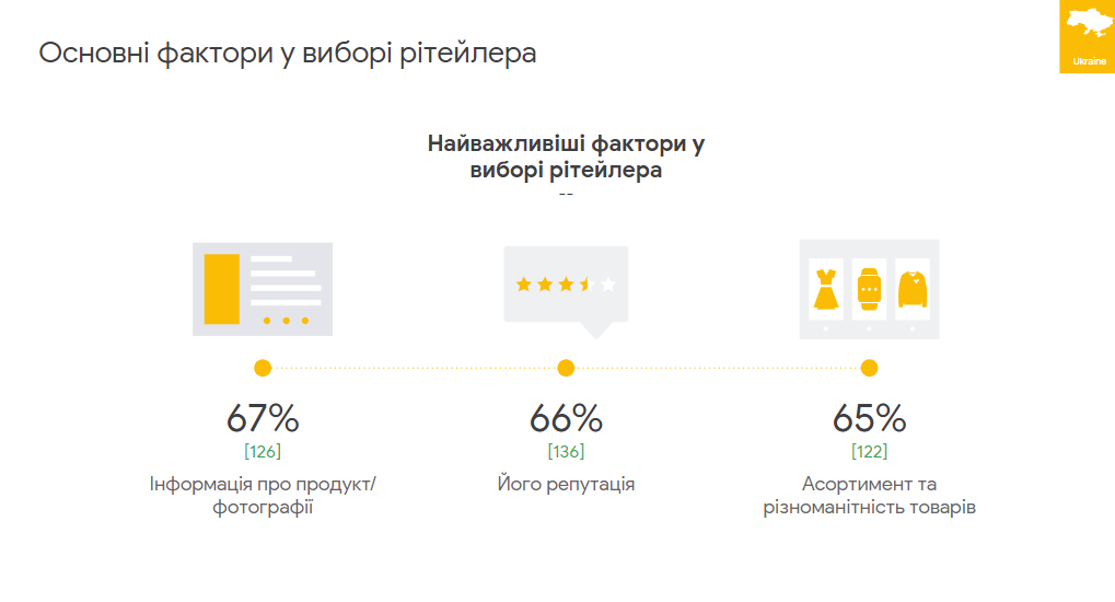 Вибираючи магазин для здійснення покупок, українці враховують три найголовніших для них фактори: 67% – кажуть про важливість інформації про продукт та наявність фотографії, 66% називають репутацію магазина і 65% – асортимент і різноманітність товару.