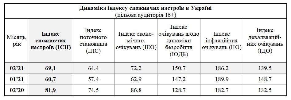 У лютому 2021 року індекс споживчих настроїв (ІСН) склав 69,1, що на 8,4 п. вище за показник січня.ІПН покращився за рахунок більшого оптимізму щодо власних доходів та розвитку економіки у найближчий рік.