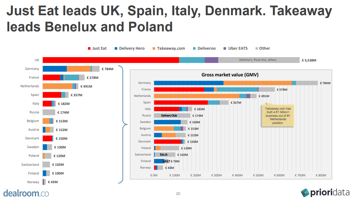 Позиції різних гравців доставки їжі на ринках країн Європи. Джерело:Dealroom.co