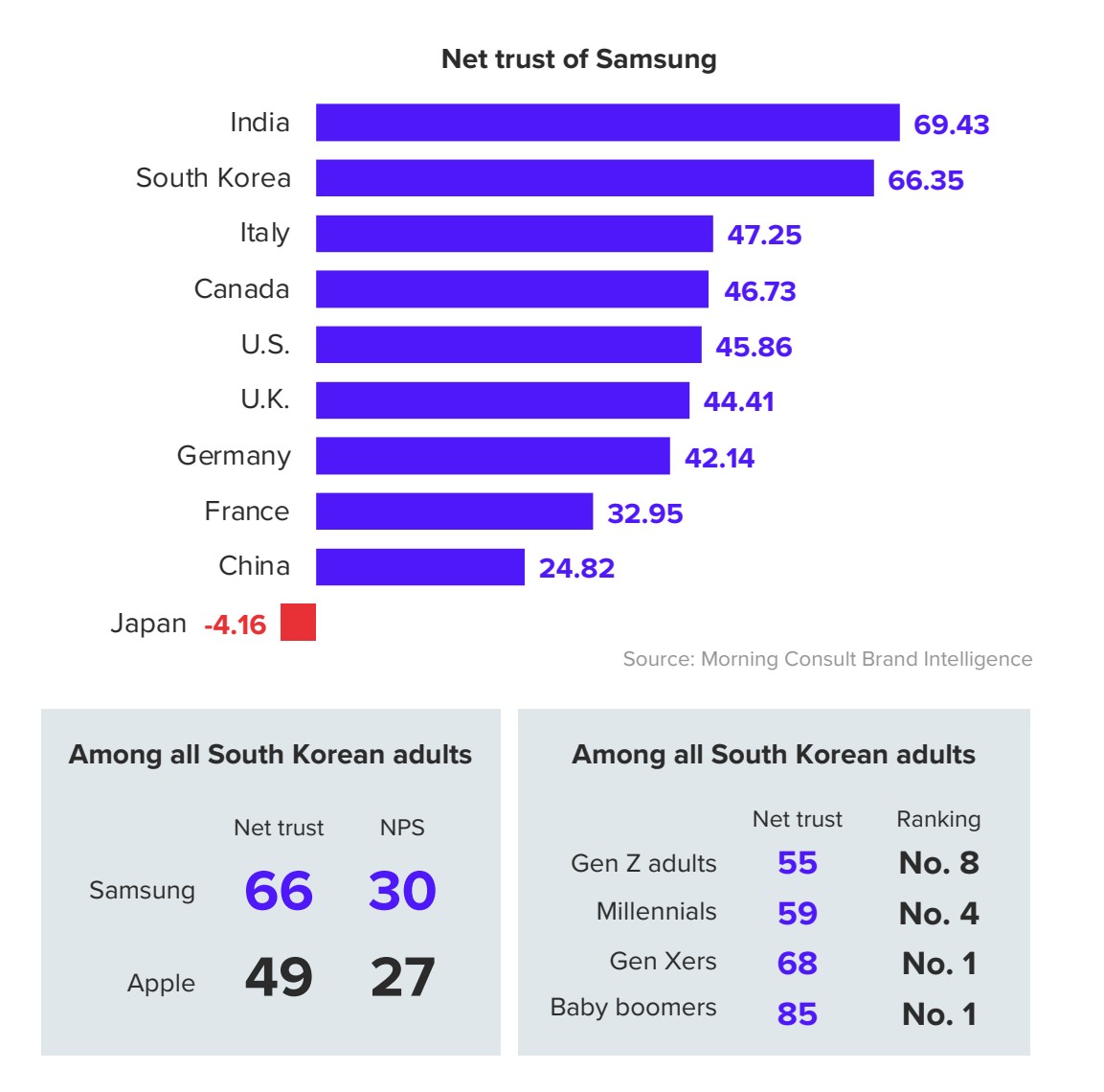 Це показує складність того, що «довіра» означає на міжнародному рівні. Хоча рівень довіри до Samsung у Південній Кореї досить високий (66 пунктів), особливо у порівнянні з конкурентом Apple (49 пунктів), індекс лояльності клієнтів (NPS) до цих брендів дуже схожий (30 проти 27 відповідно). Причому чим молодші споживачі, тим більше вони довіряють вже американським брендам, таким як Google, Netflix і Nike.