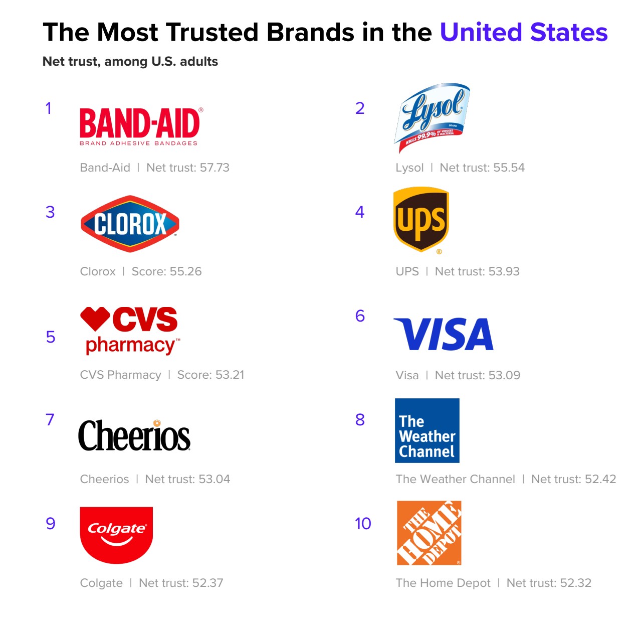 Один з чинників, які впливають на лояльність: бути корисними. Наприклад, пандемія триває вже третій рік, й американці продовжують довіряти брендам, які зробили свій внесок у їхній особистий добробут або умови життя. Так, Band-Aid, Lysol та Clorox займають перші три рядки у рейтингу в США.