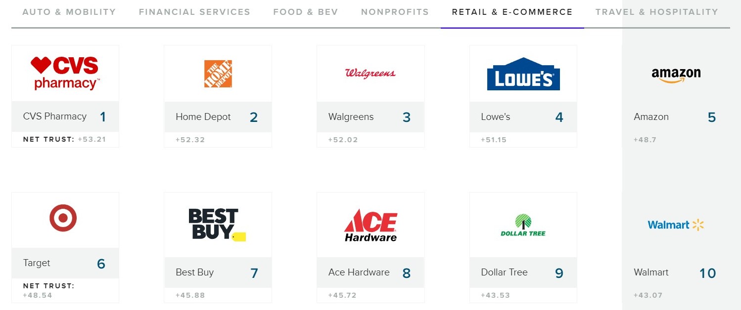 У сфері рітейлу та електронної комерції американський рейтинг довіри виглядає наступним чином.