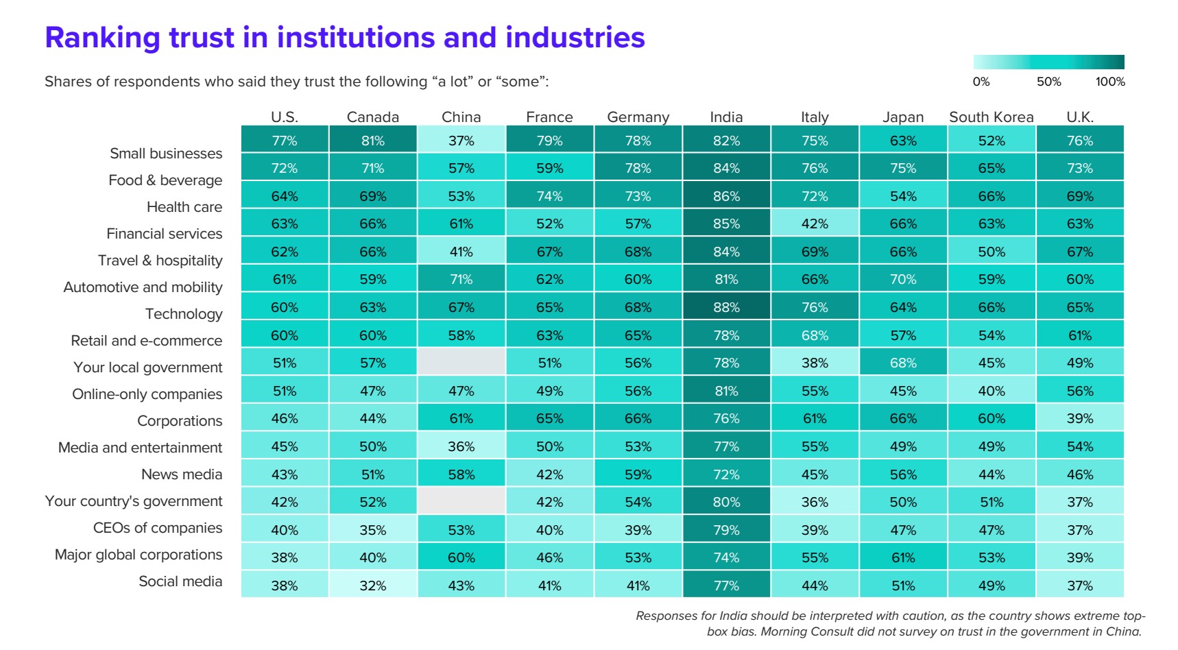 Охорона здоров’я, фінансові послуги та виробництво продуктів харчування та напоїв найчастіше називають секторами, в яких важлива довіра. Малий бізнес загалом має велику довіру в світі – здебільшого в Північній Америці та Європі довіра до малого бізнесу досить висока, але в опитаних азіатських країнах існує значний розрив у довірі. Так, найменше довіряють цьому сегменту у Китаї (37%) та Південній Кореї (52%), але найбільший процент довіри у жителів Індії (82%). Проте сфера рітейлу демонструє більш-менш стабільний рівень приблизно у 60% по всіх регіонах світу.