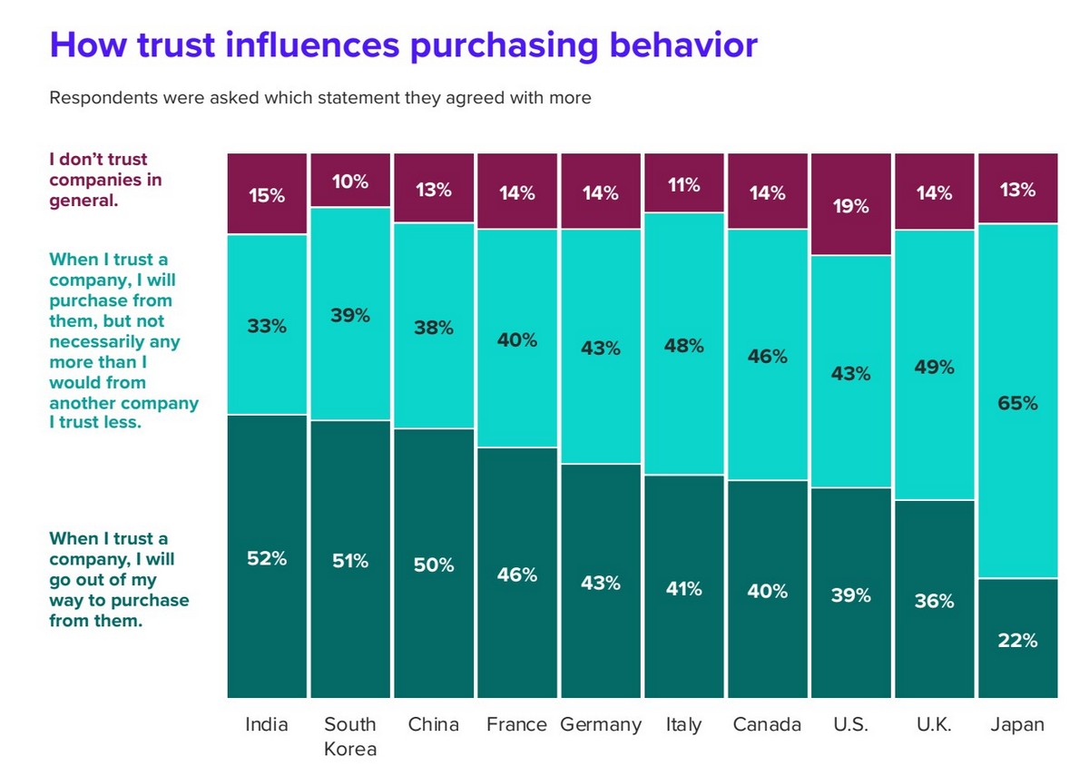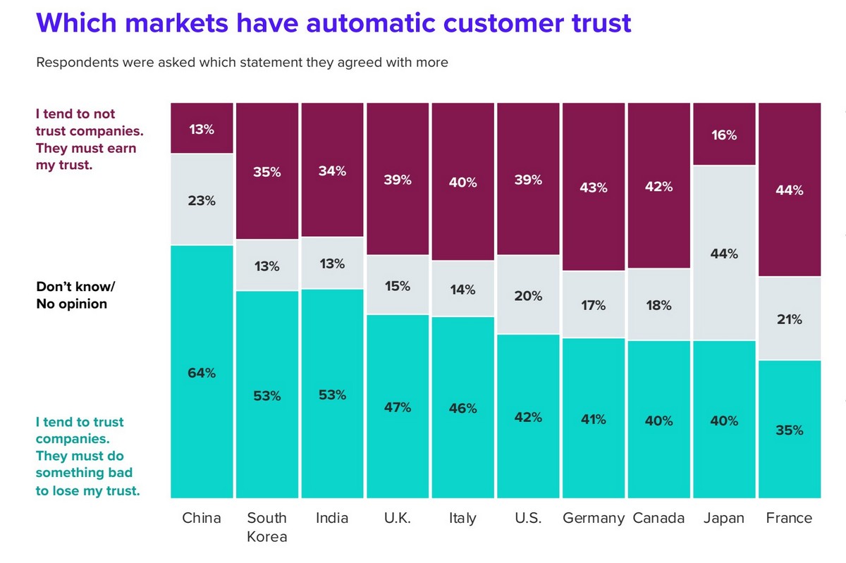 Якщо розглядати загалом довіру до бізнесу та компаній по різних частинах світу, помітно, що покоління Z та респонденти-міленіуми у Канаді та Франції відносяться до найменш довірливої спільноти. У Сполучених Штатах і дохід, і освіта є визначальними факторами довіри: що вищий рівень того й іншого, то вища ймовірність того, що споживачі довіряють компаніям. У Китаї міленіали та городяни мають один з найвищих рівнів довіри до компаній, у той час як дорослі покоління Z та мешканці передмість та сільських районів відстають. Найбільш байдужі до цього питання в Японії – цілих 44% не знають, чи довіряти бізнесу чи ні.