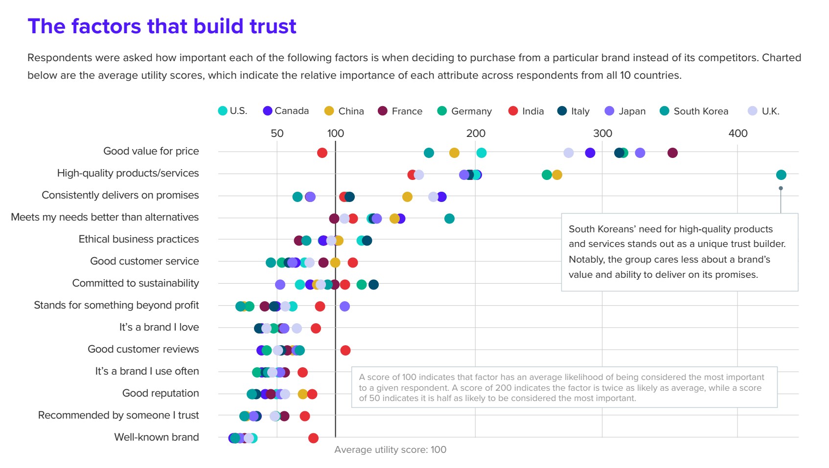 Хороше співвідношення ціни та якості мають вирішальне значення для зміцнення довіри. Окрім цього в трійку найбільш важливих факторів входять якість товарів та послуг, а також те, що компанія стабільно виконує обіцянки. Респонденти з різних країн назвали менш важливими інші елементи, такі як етична ділова практика та гарне обслуговування клієнтів. На графіку нижче оцінка 100 вказує на те, що фактор має середню ймовірність вважатися найважливішим для цих респондентів. Оцінка 50 вказує на те, що ймовірність того, що він буде вважатися найважливішим, вдвічі нижча.