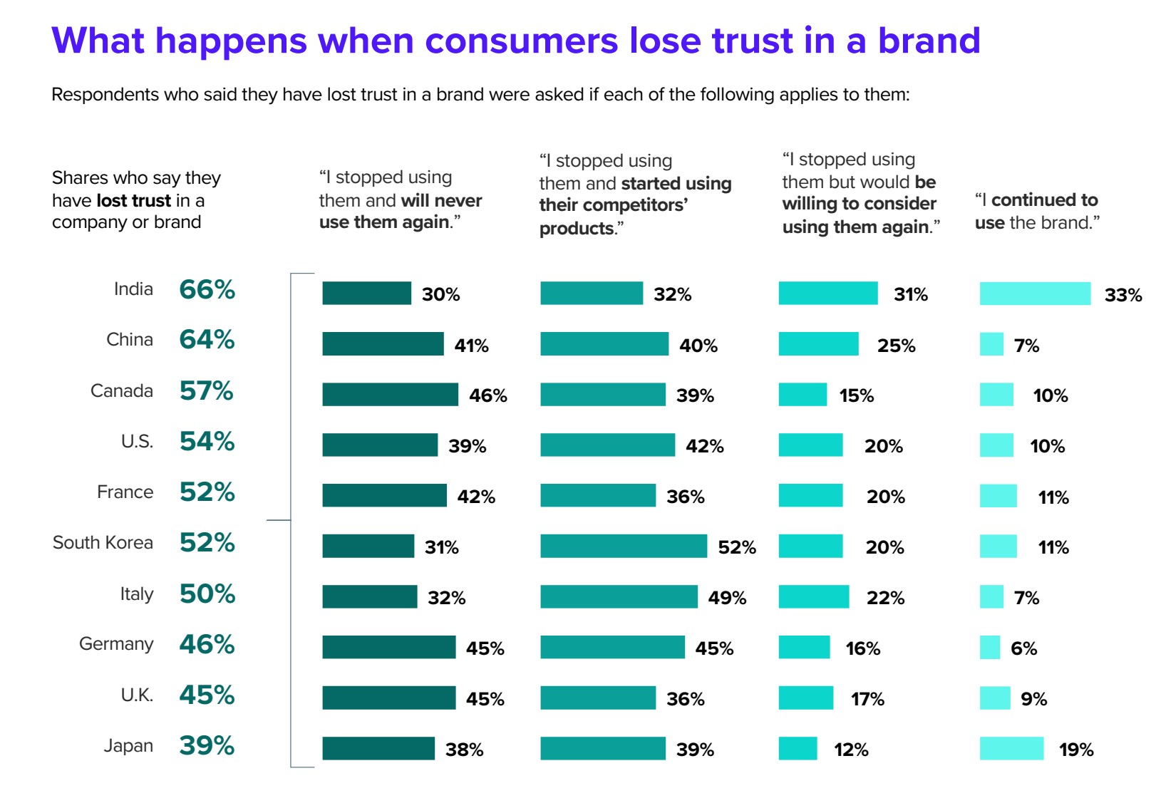 Але погане обслуговування клієнтів є основним фактором, що підриває довіру. Погане обслуговування клієнтів та погіршення якості продукції були одними з основних причин, через які споживачі у всьому світі втрачають довіру до брендів. Позиція бренду у конкретних випадках, з якою не погоджується споживач, є третьою причиною підриву довіри.