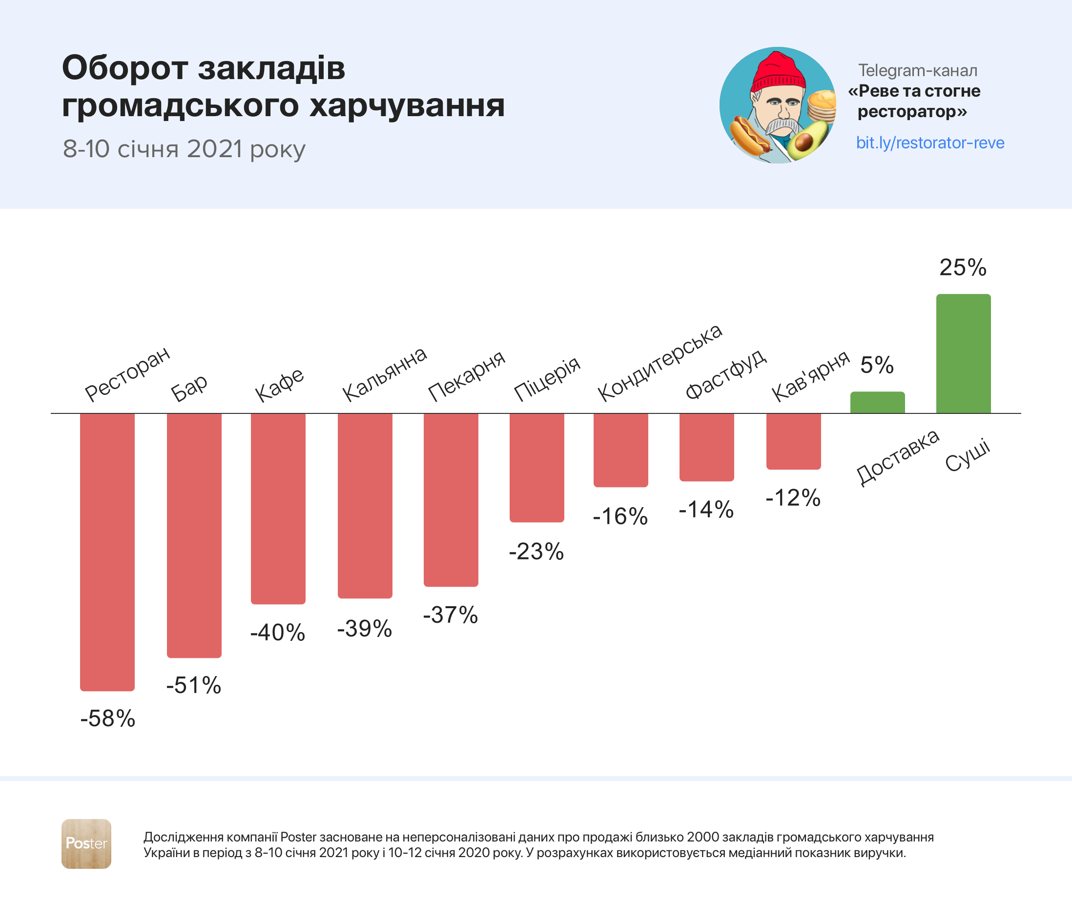 Про це свідчать результати дослідження компанії по автоматизації кафе і ресторанів Poster, опубліковані в Telegram-каналі компанії «Реве та стогне ресторатор». Найсильніше падіння виручки спостерігається у ресторанів – 58% і барів – 51% в порівнянні з аналогічним періодом минулого року. Кафе і кальянні втратили 40% і 39% виручки відповідно. Пекарні – 37%, піцерії – 23%, фаст-фуд – 14%, кондитерські – 16%, а кав’ярні – 12% від торішніх продажів.