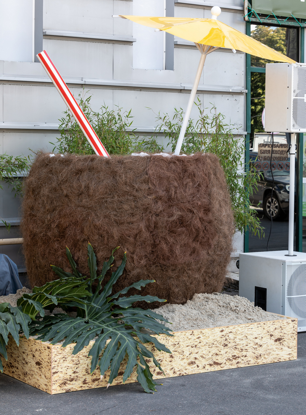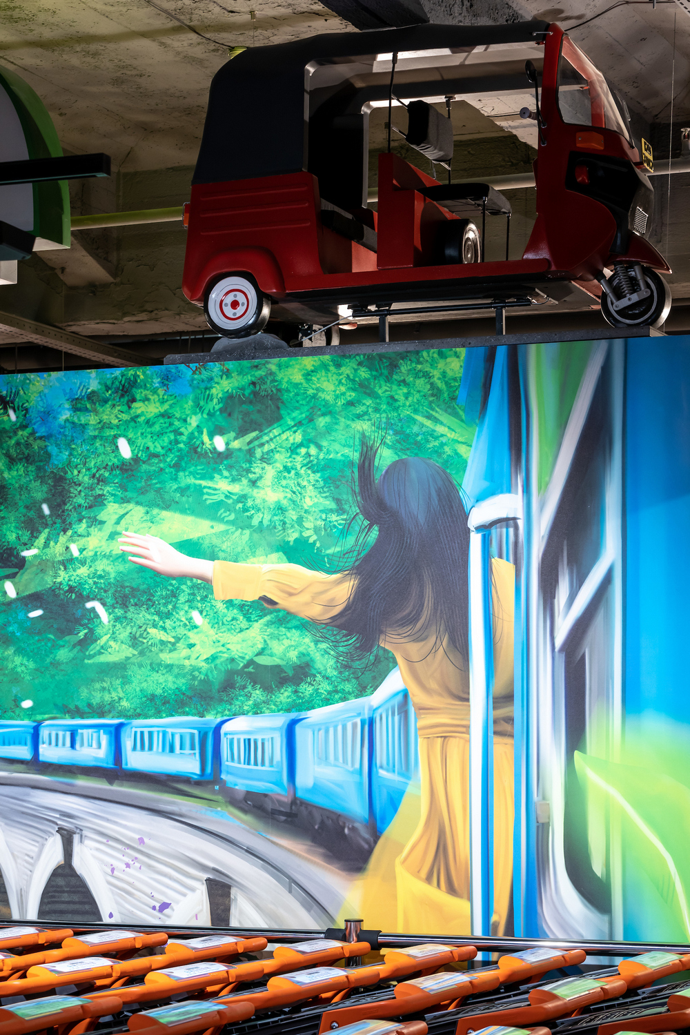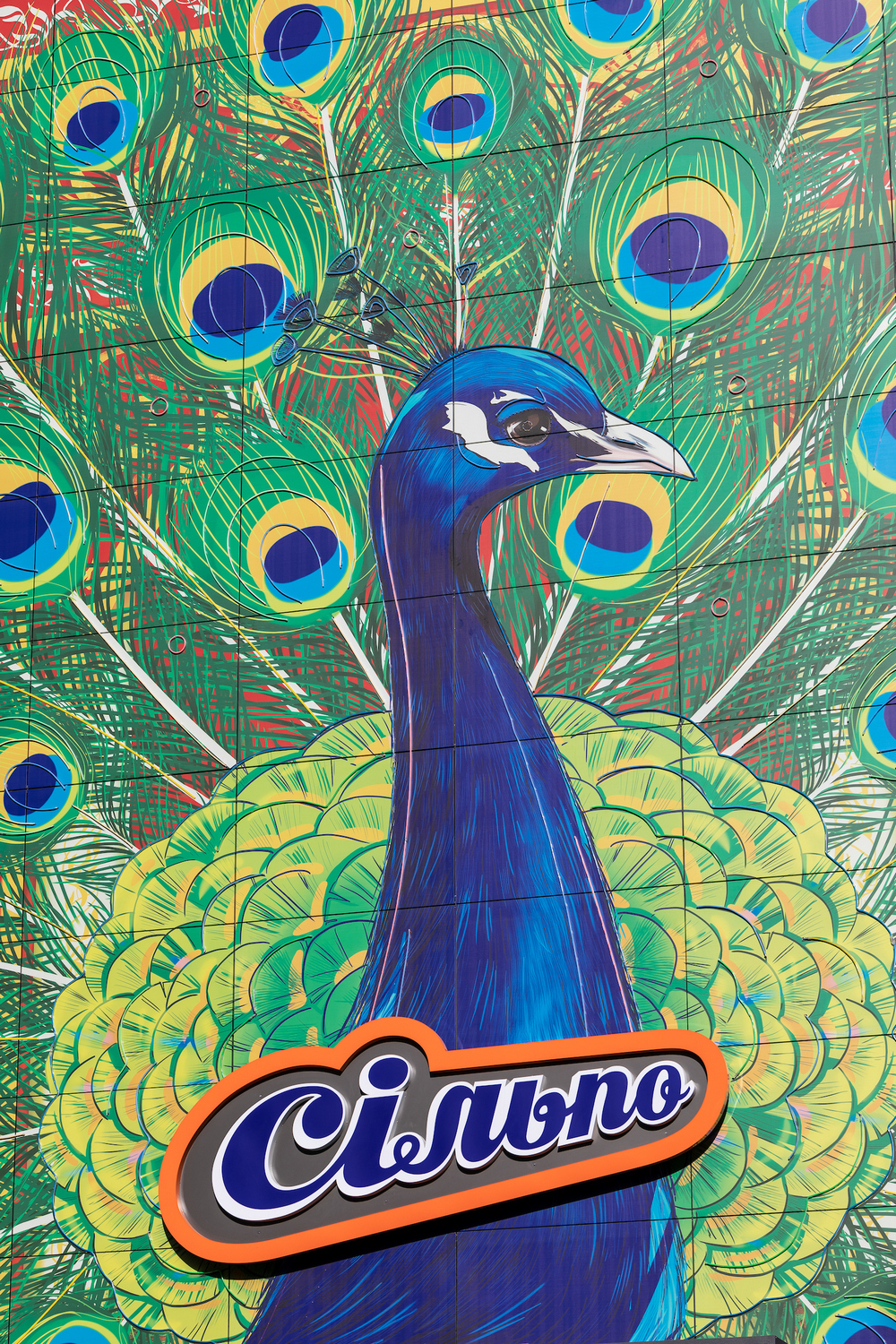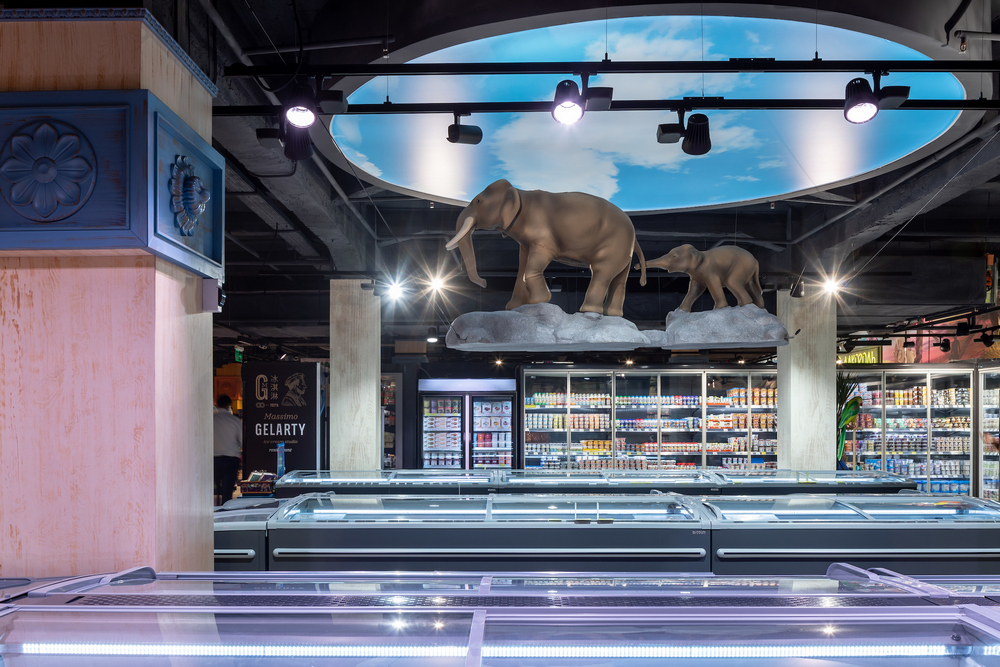 Велику динамічну скульптуру шрі-ланкійського слона зі слоненям під блакитним небом можна знайти у молочному відділі — дитинча тримає маму хоботом за хвіст, а вона піднімає та опускає ногу.
