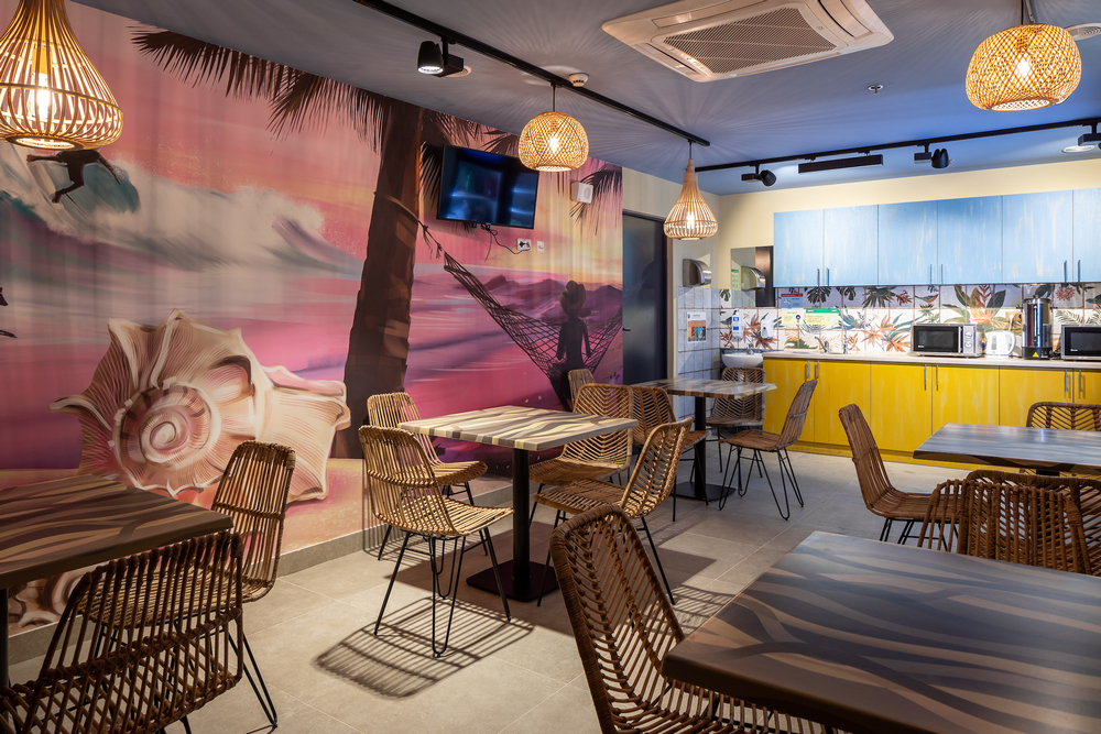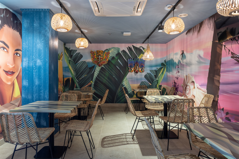 На стінах — сцени сафарі на джипах, які з полювання перетворилися на поїздки-спостереження за дикими тваринами. Серед зображень схований образ відомого туриста — інспектора Коломбо, мов алюзія на назву столиці острову та відомого на теренах України герою серіалу. Він ніби спостерігає за життям мешканців острову, як вони вирощують їжу, ловлять рибу, катаються на хвилях Індійського океану та збирають екзотичні фрукти.