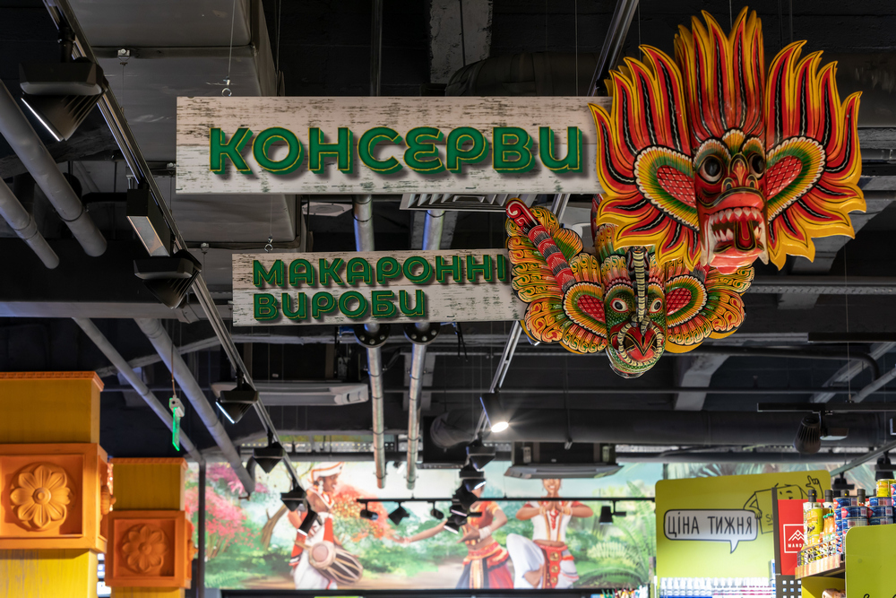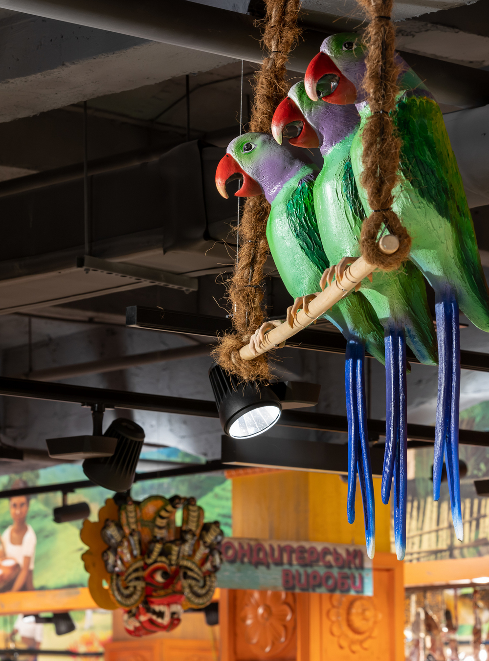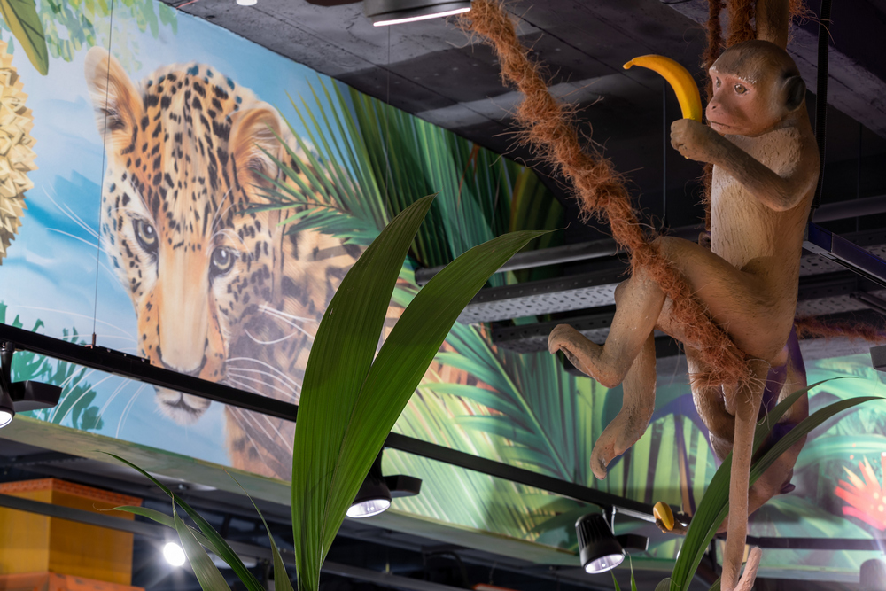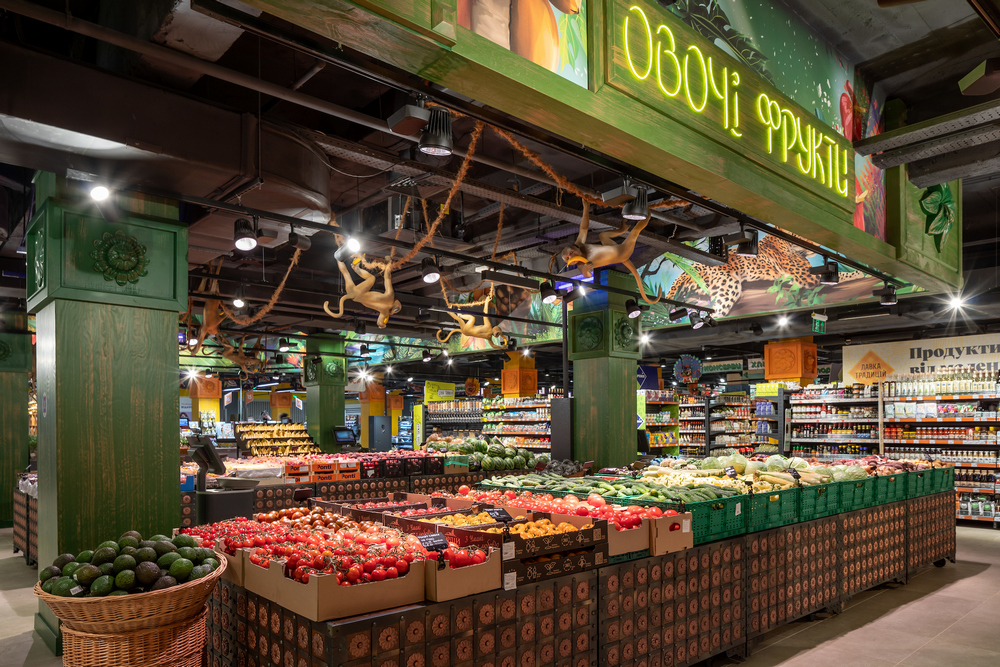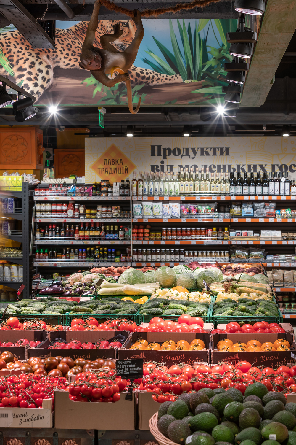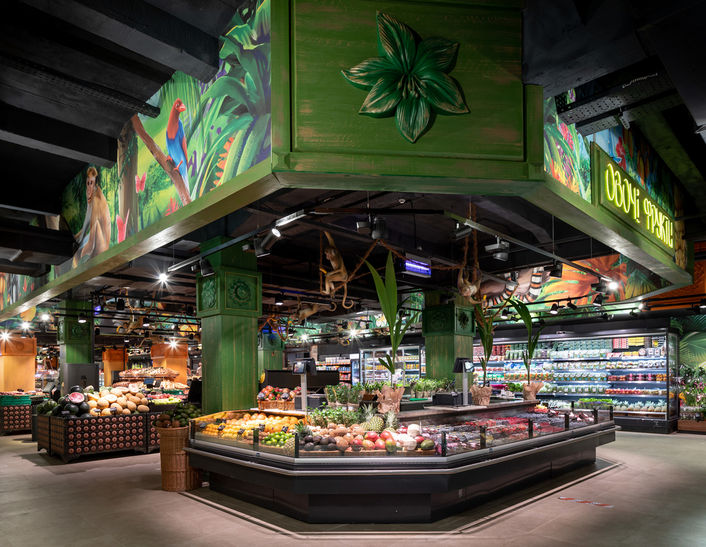 У зоні овочів та фруктів під стелею “стрибають мавпи”, а на стінах зображені зелені хащі зі зміями, папугами та іншими птахами.