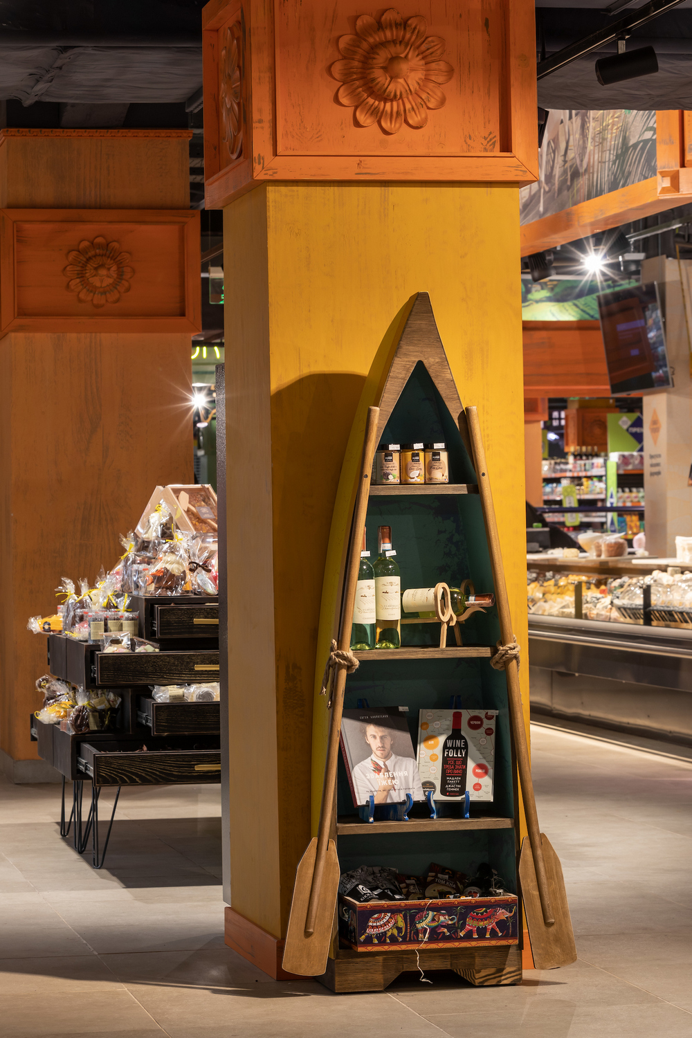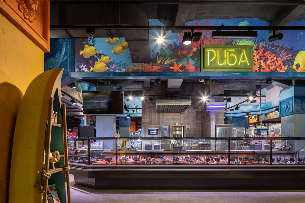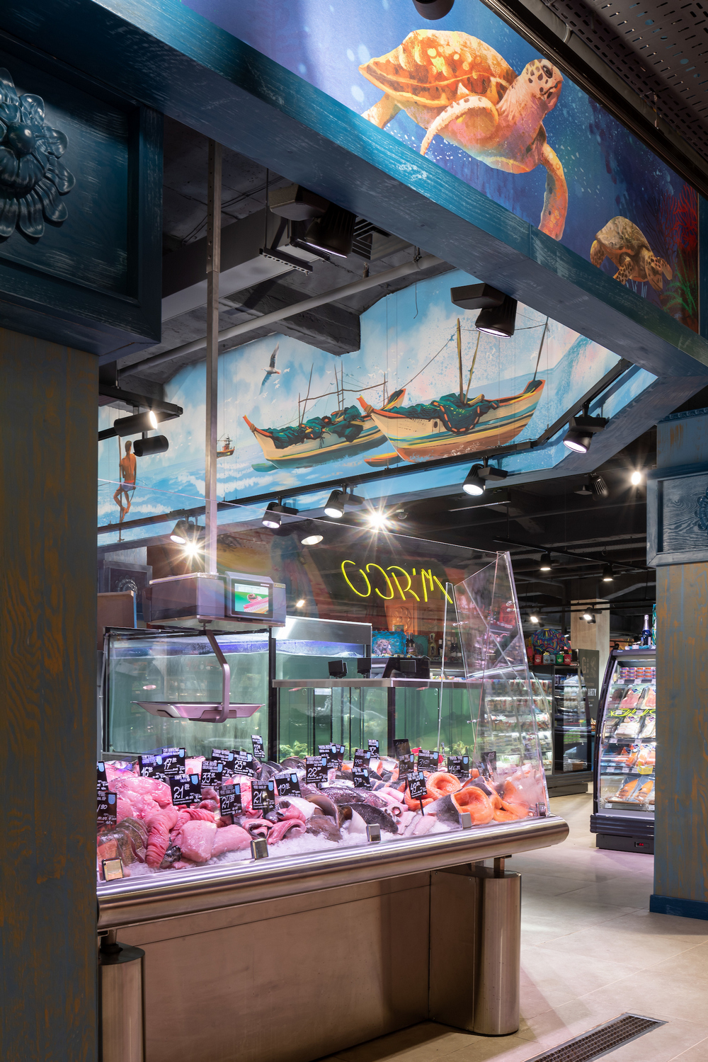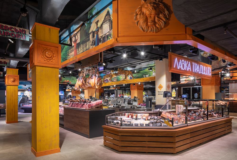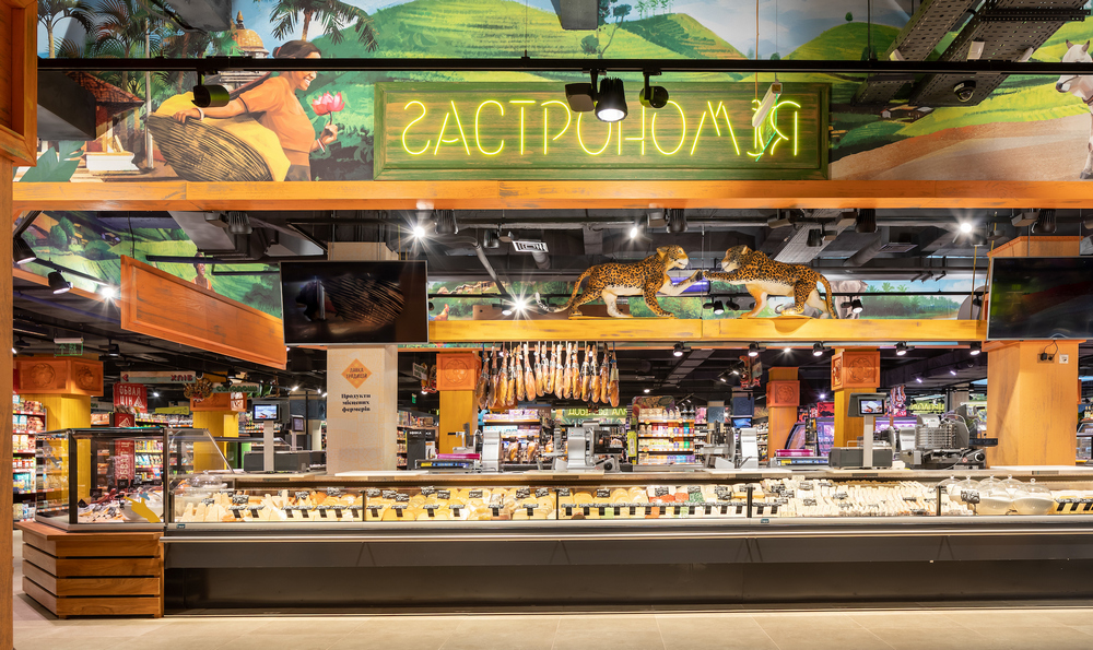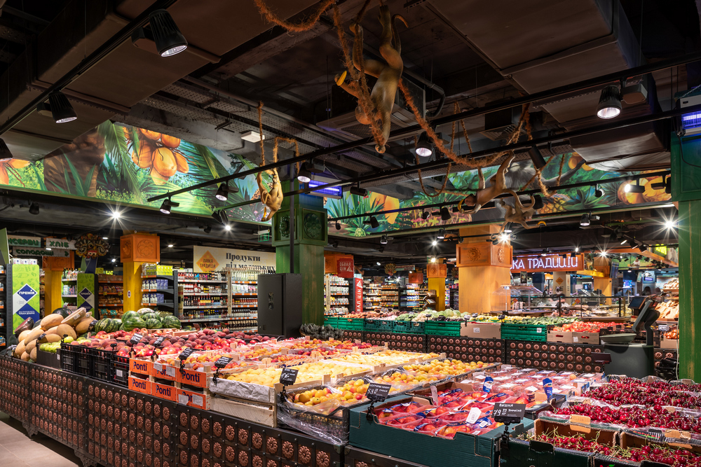 У зоні овочів та фруктів під стелею “стрибають мавпи”, а на стінах зображені зелені хащі зі зміями, папугами та іншими птахами.