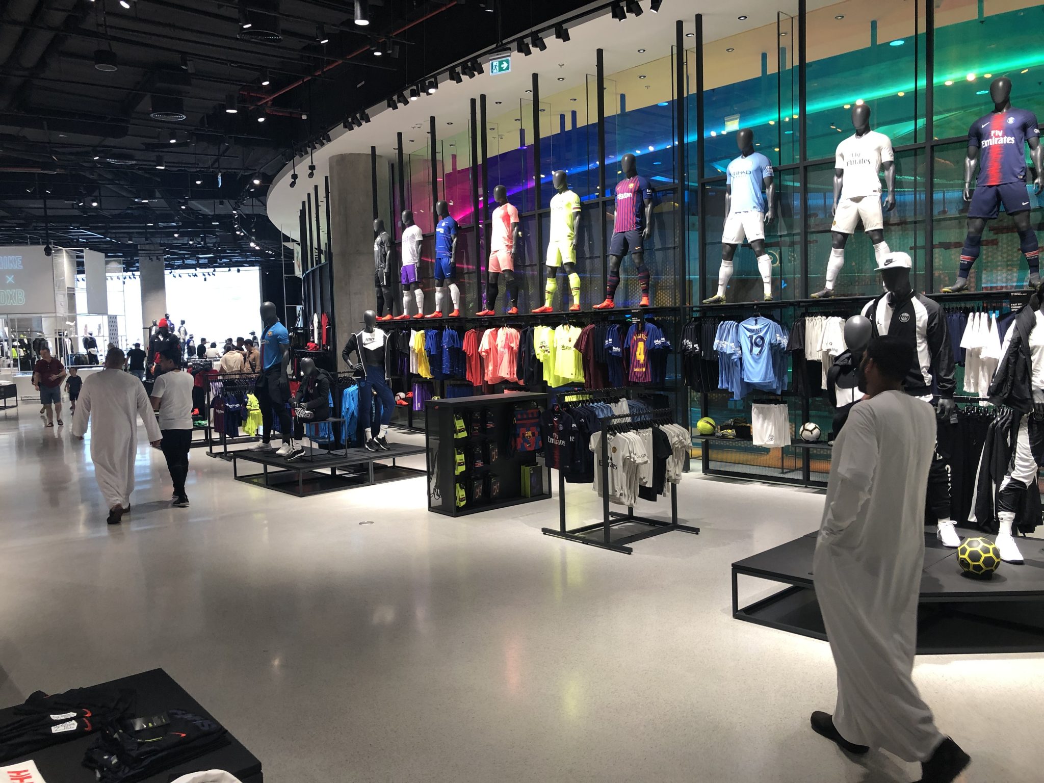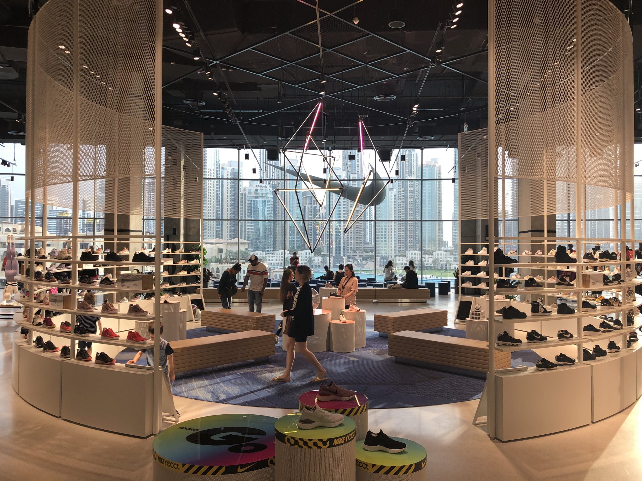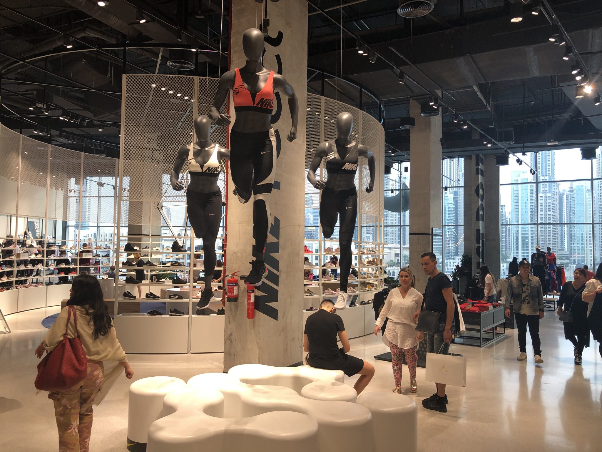 Американський бренд спортивного одягу Nike відкрив у найбільшому торговому центрі світу Dubai Mall флагманський магазин. Площа об’єкту склала 3290 кв. м, що зробила його найбільшою торговою точкою бренду на Близькому Сході і в Північній Африці. Крім основних залів, присвячених окремим видам спорту, в магазині є лаунж-зона з пуфиками, де покупці можуть відпочити і насолодитися видом на танцюючі фонтани. У більшості залів представлені товари для чоловіків – асортимент для жінок пропонують в одному окремому залі. Також є окремі зони, де продаються дитячі речі.