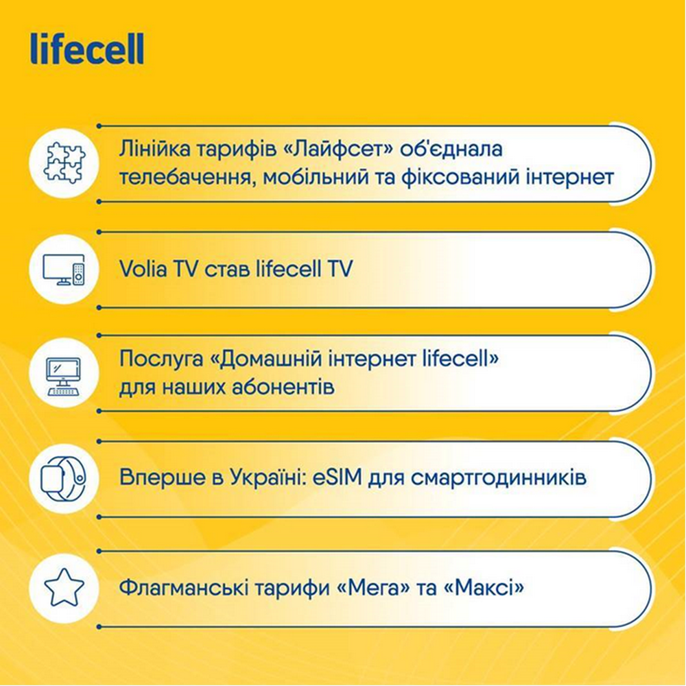 lifecell – український постачальник електронних комунікацій, який надає послуги мобільного зв’язку та передачі даних на основі швидкісного інтернету. lifecell пропонує вигідні тарифи та послуги для користувачів смарт-пристроїв. Компанія розвиває екосистему для реалізації проєктів зі створення «розумних» міст та надає широкий спектр рішень для B2B-сегменту: інструменти на основі Big Data, універсальні рішення для автоматизації маркетингових кампаній, сервіси із кібербезпеки, дистанційного моніторингу бізнесу та IP-телефонії. Станом на кінець 2 кварталу 2025 року lifecell обслуговує 9,6 мільйона абонентів.