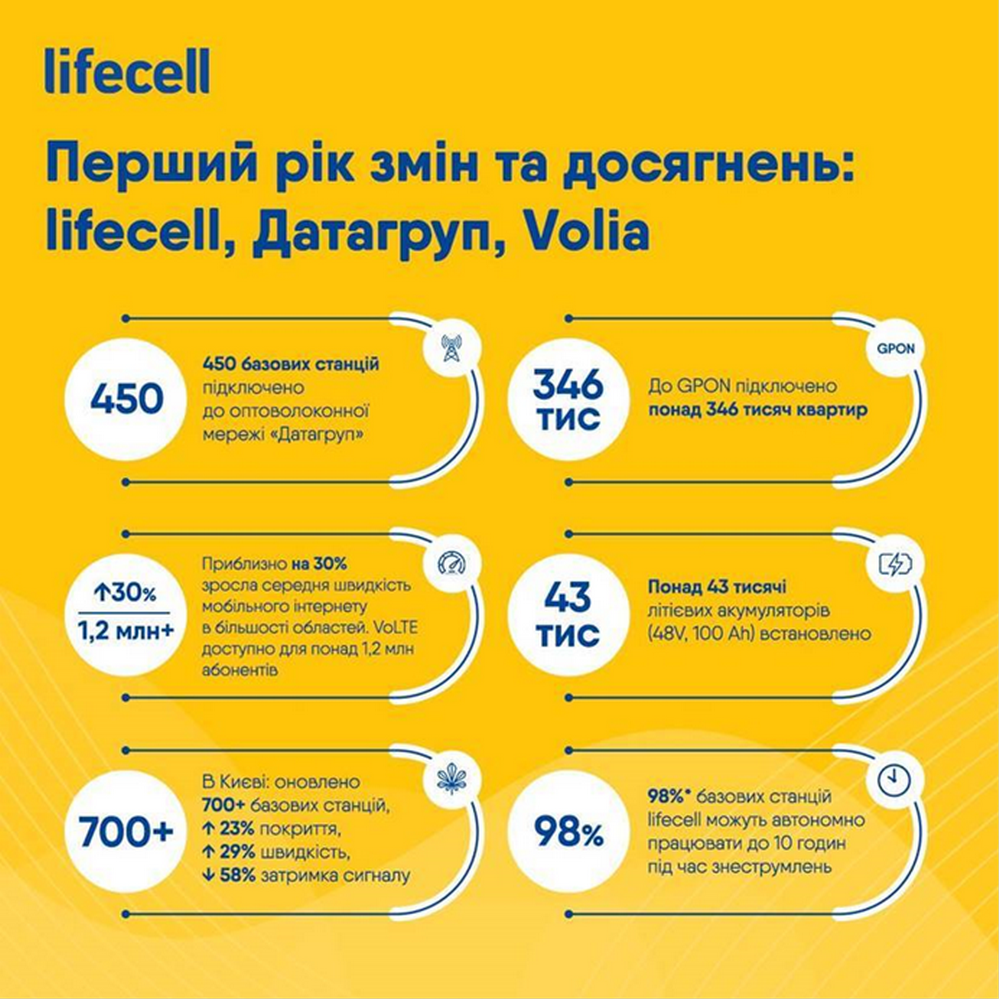 Зокрема, 450 базових станцій lifecell було підключено до високошвидкісної оптоволоконної мережі Датагруп, що забезпечує пропускну здатність до 10 Гбіт/с на станцію, покращує якість зв’язку та збільшує обсяг передачі даних між базовими станціями та ядром мережі. До кінця 2025 року планується підключити загалом 800 станцій.