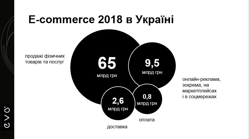 Обіг фізичних товарів і послуг, придбаних онлайн у 2018 році, сягає 65 млрд грн. Виручка від їхньої реклами в соцмережах, на маркетплейсах та онлайн-ресурсах гравців ринку — 9,5 млрд грн. На доставці товарів, придбаних онлайн, оператори заробили 2,6 млрд грн, на онлайн-оплатах — 0,8 млрд грн.