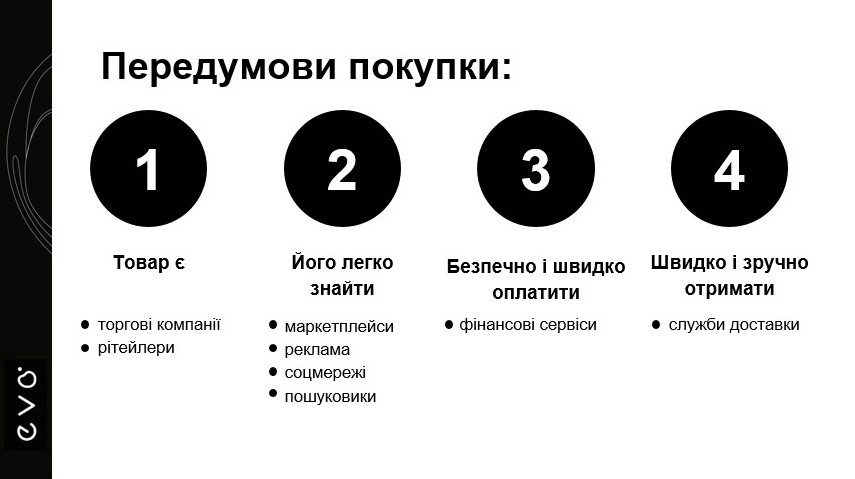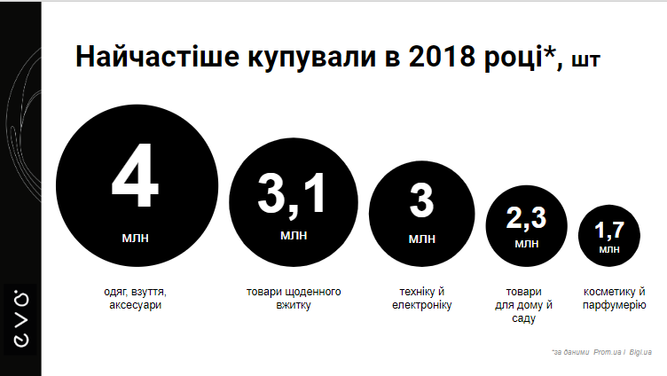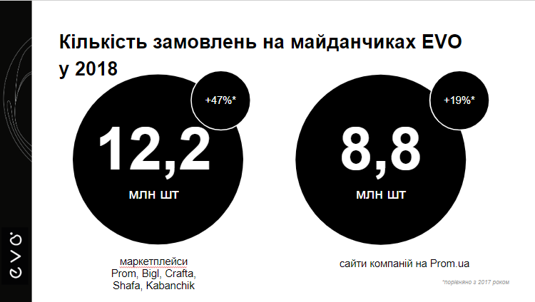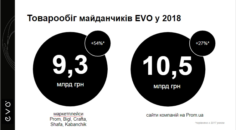 Також спеціалісти компанії вказують, що довіра до інтернет-покупок зростає. За рік на маркетплейсах EVO (Prom.ua, Bigl.ua, Crafta.ua, Shafa.ua) українці придбали товарів на 9,5 млрд грн та на 10,5 млрд гривень — на сайтах компаній на Prom.ua.