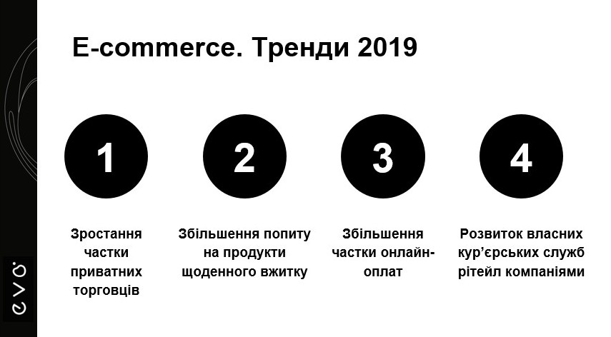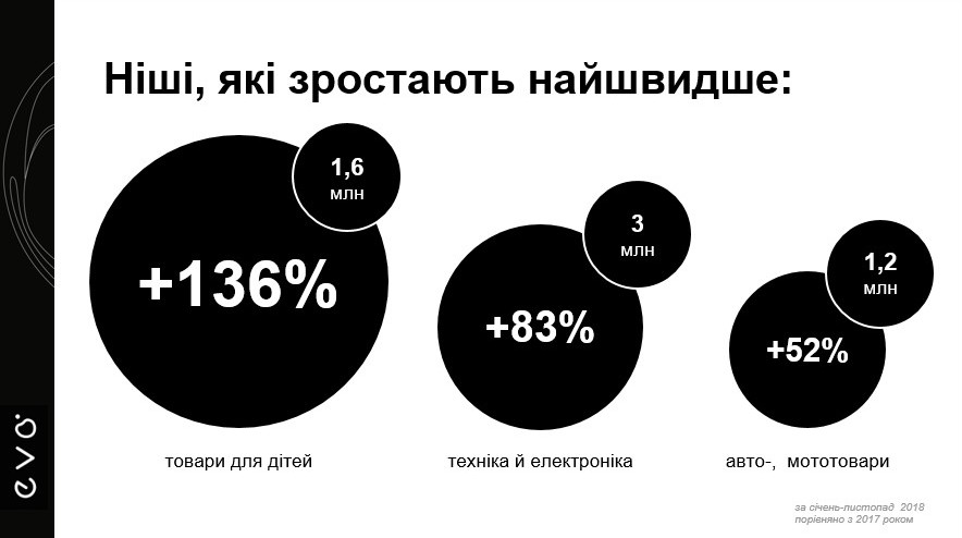 Найбільш активно зростають такі категорії: товари для дітей, авто- і мото-, а також техніка й електроніка. «Ми очікуємо, що у 2019 році також зросте попит онлан-покупки на продуктів харчування», – завершив свій виступ директор з розвитку групи компаній EVO.