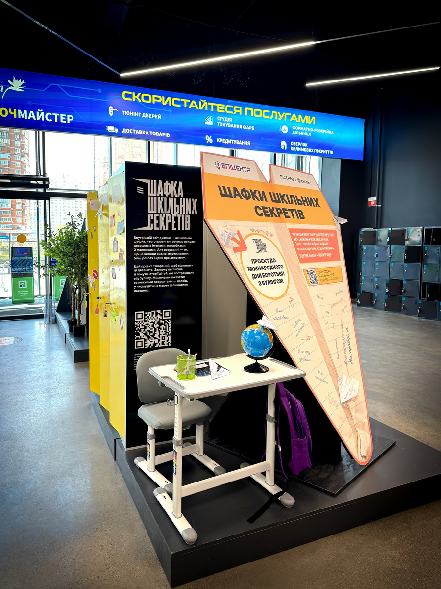 В межах проєкту «Шафки шкільних секретів» в столичних торгових центрах Епіцентр з’явились інсталяції з реальними історіями про цькування, які діти зазвичай приховують.