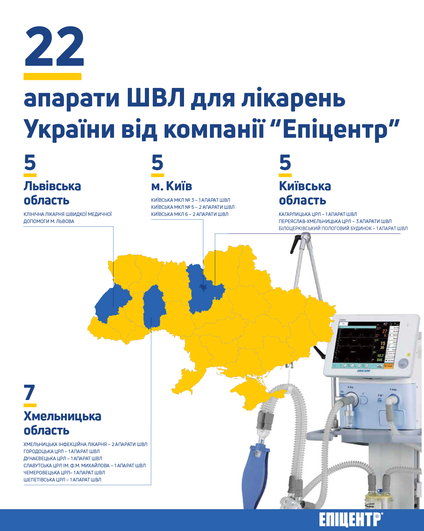 Компанія Епіцентр К передала 22 апарати штучної вентиляції легенів до медичних закладів України, які лікують хворих на коронавірус. Медичне обладнання за рекомендаціями Міністерства охорони здоров’я було розподілено між лікарнями Київської (5 апаратів ШВЛ), Львівської (5), Хмельницької (7) областей та міста Київ (5).