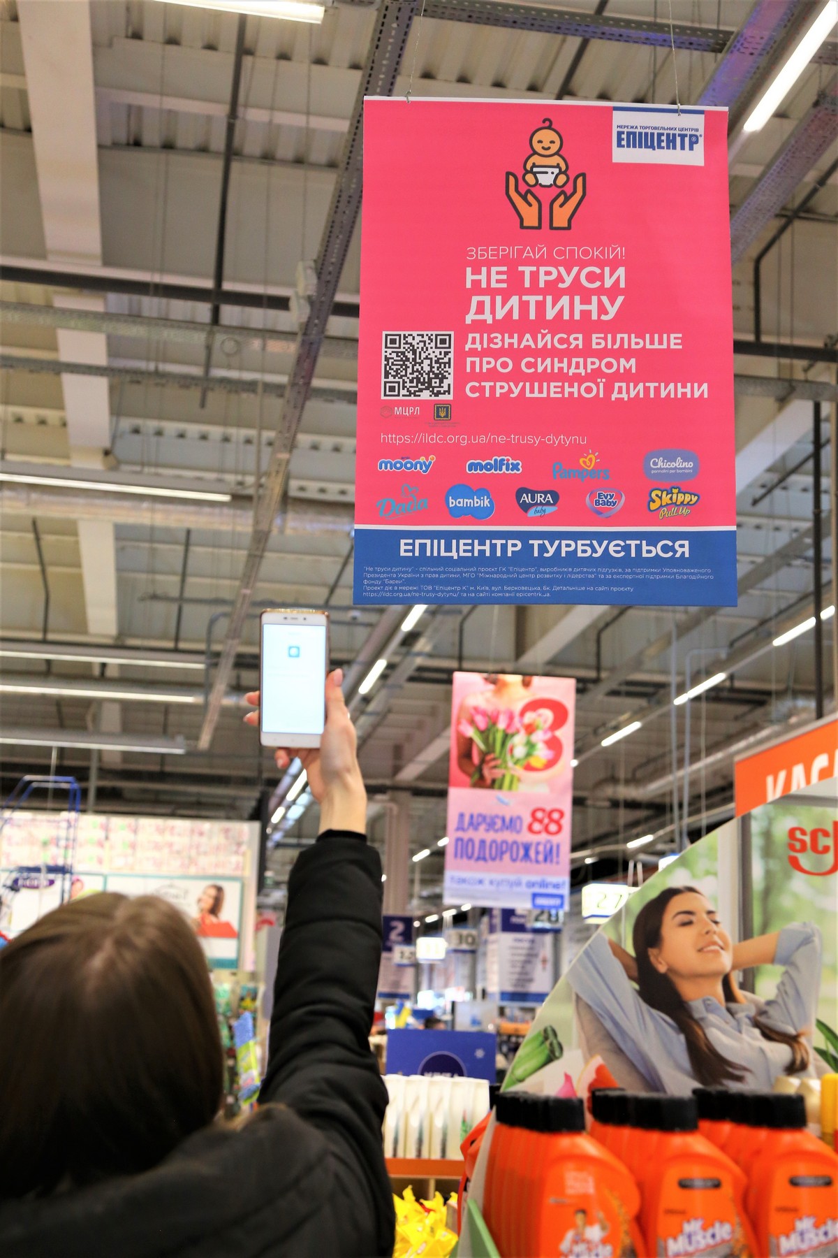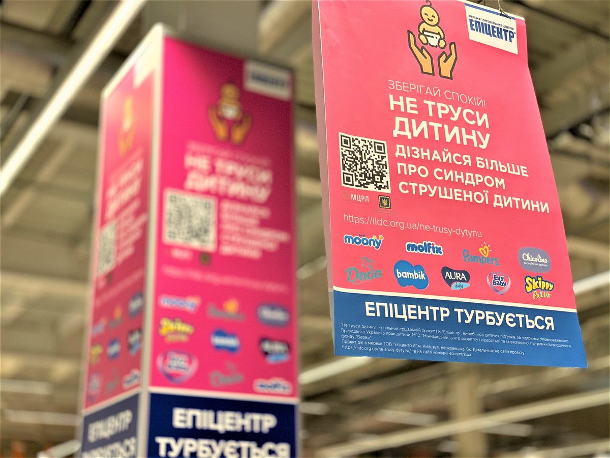 Придбавши пачку підгузків провідних виробників у мережі Епіцентр, покупці бачитимуть на них відповідну наліпку — «Не труси дитину», з інформацією про проект. У торгових залах мережі розміщено банери для батьків з інформацією про ССД. Соціальний ролик щодо небезпеки ССД транслюватиме понад 700 медіа-екранів у всіх 64 ТЦ Епіцентр. Крім того, Епіцентр запустив серію освітніх роликів для батьків з порадами та інформацією про синдром струшеної дитини від відомих українських педіатрів на власному Youtube-каналі.