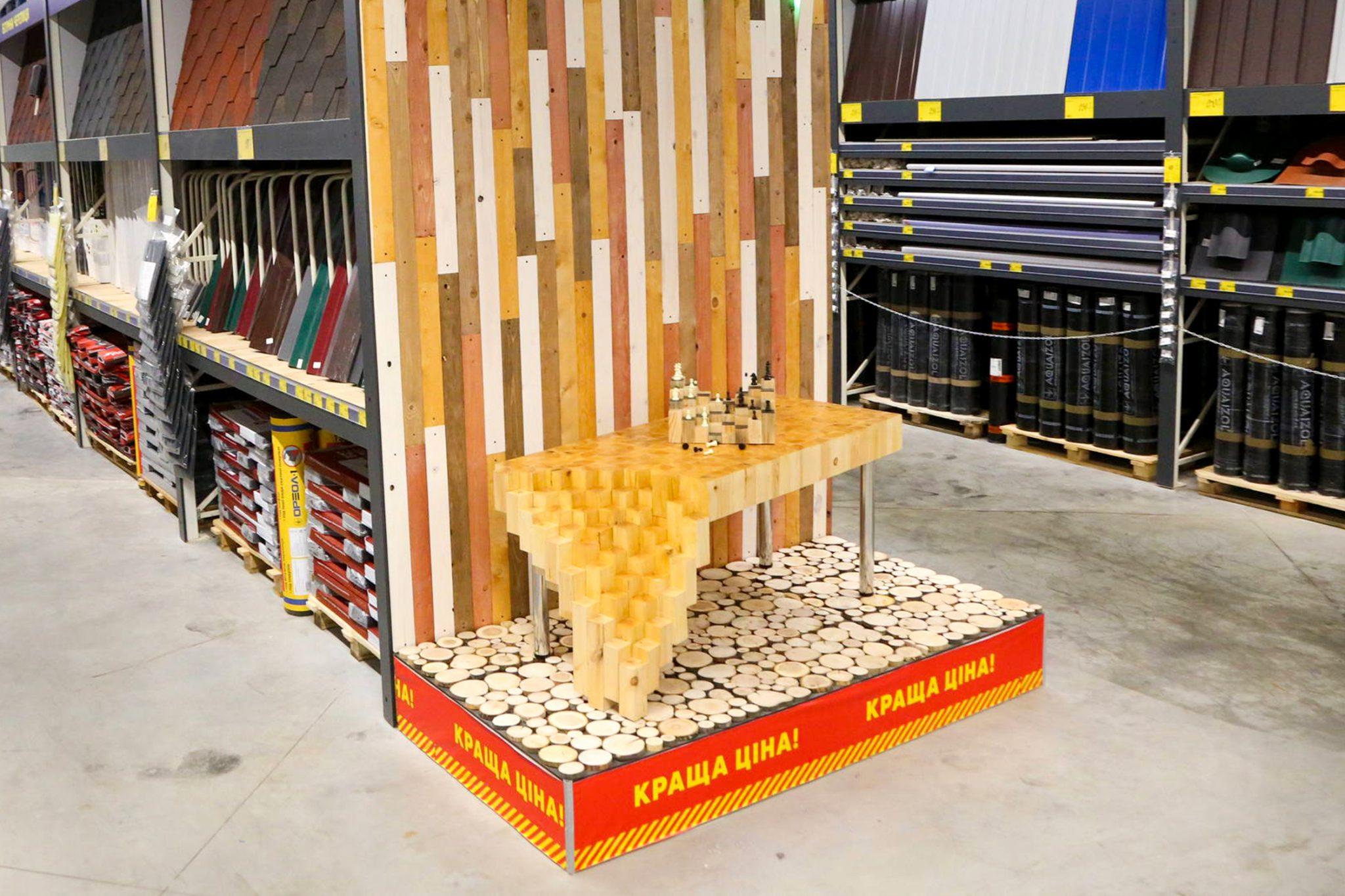 У двоповерховому торговельному центрі працює 15 відділів, в асортименті яких представлені майже 110 000 найменувань товарів: автотовари, електро- і побутова техніка, меблі, фарби, вироби з дерева, посуд, текстиль, канцтовари, сантехніка, спортивні та дитячі товари тощо. Серед найбільших відділів – «Сад і город» (3267 кв. м), «Вироби з дерева» (1496 кв. м) і «Сантехніка» (1389 кв. м).