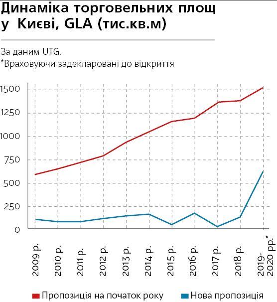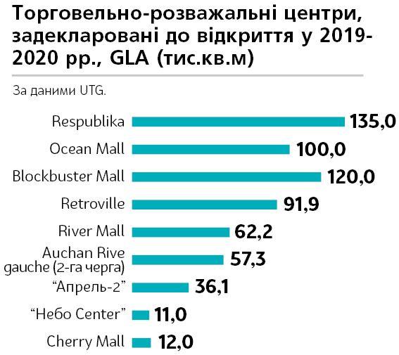 Водночас є надія на суттєве покращення цього показника протягом найближчих двох років. За підрахунками Костянтина Олійника, керівника департаменту стратегічного консалтингу компанії UTG, заявлений обсяг перспективної пропозиції на 2019-20 роки складає 625 600 кв. м з урахуванням відновлення будівельно-монтажних робіт та вводу в експлуатацію ТРЦ Respublika (див. “Торговельно-розважальні центри, задекларовані…”).