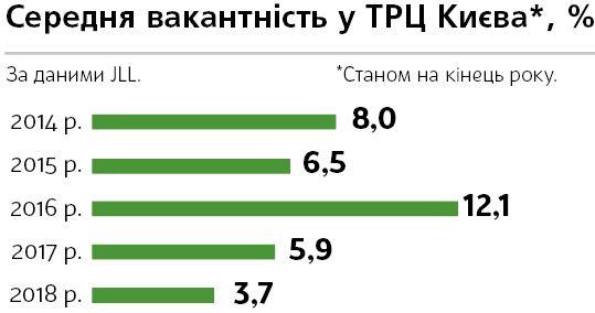Через брак якісних торговельних площ показник вакантності за минулий рік впав до рекордно низького рівня. За даними компанії JLL, після тривалого зменшення частки вільних площ, що спостерігається два роки поспіль, у IV кварталі 2018-го цей показник стабілізувався на рівні 3,7% (див. “Середня вакантність…”). Разом із вакантністю стабілізувалася й вартість оренди. “У першому півріччі минулого року орендні ставки зросли на 20% і майже досягли докризового рівня — $1,14 тис. за 1 кв. м на рік (чи $95 за 1 кв. м на місяць), — зазначає Катерина Весна, начальник відділу торгових площ компанії JLL (Україна). — До кінця року орендні ставки стабілізувалися”.