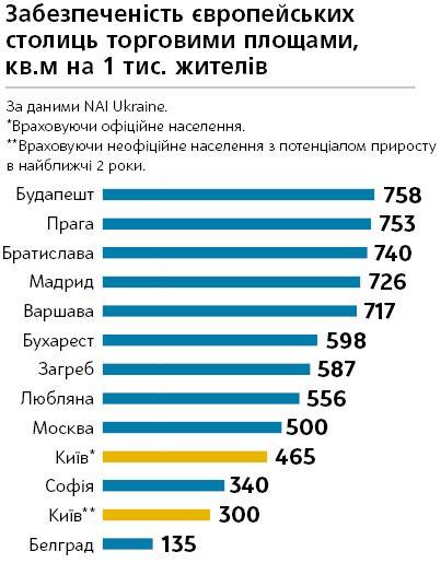 Бум відкриття “торгових площ” триває й цього року: у січні в експлуатацію введені ще два нових об’єкти — Smart Plaza Obolon та Oasis (сумарний GLA складає майже 20 000 кв. м). Однак навіть з урахуванням цих відкриттів Київ все ще далекий від середнього європейського показника насиченості торговельними площами. Якщо враховувати “офіційне” населення української столиці, на 1000 мешканців припадає лише 465 кв. м, а якщо підрахувати кількість “неофіційних” киян з потенціалом приросту в найближчі два роки, то показник зменшиться до 300 кв. м на тисячу мешканців. Тоді як у столицях європейських сусідів він удвічі більший (див. “Забезпеченість…”).
