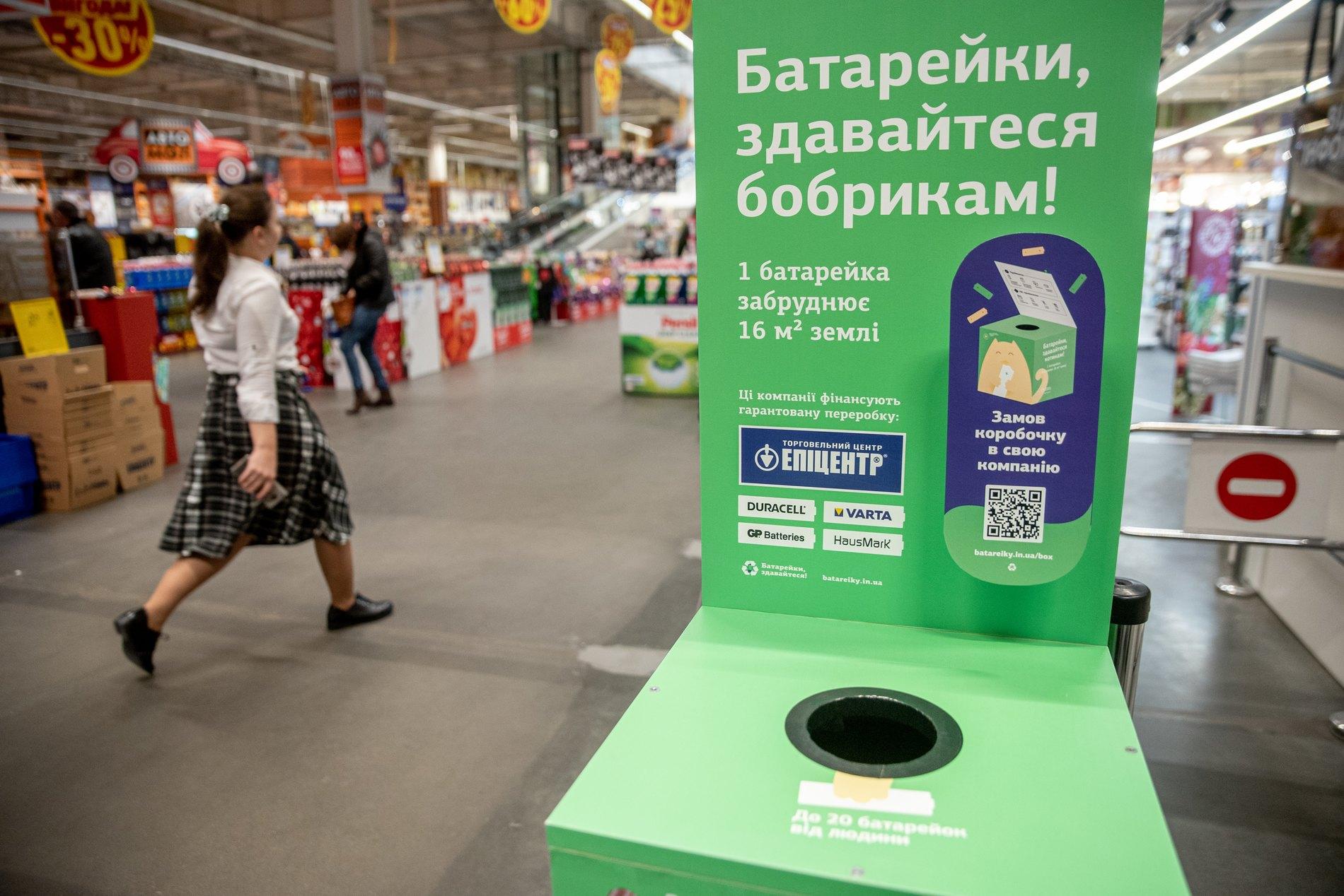 Як повідомляє The Village Україна, перші бокси встановили 10 грудня у торгових центрах Епіцентр і Нова Лінія в Києві. До кінця тижня мережі встановлять контейнери для прийому батарейок по всій Україні. Одна людина може здати безкоштовно до 20 використаних батарейок за раз. Переробку всіх батарейок, зібраних в Епіцентрі, оплачує торгова мережа спільно з імпортерами батарейок. Перше відправлення заплановане на початок 2020 року.