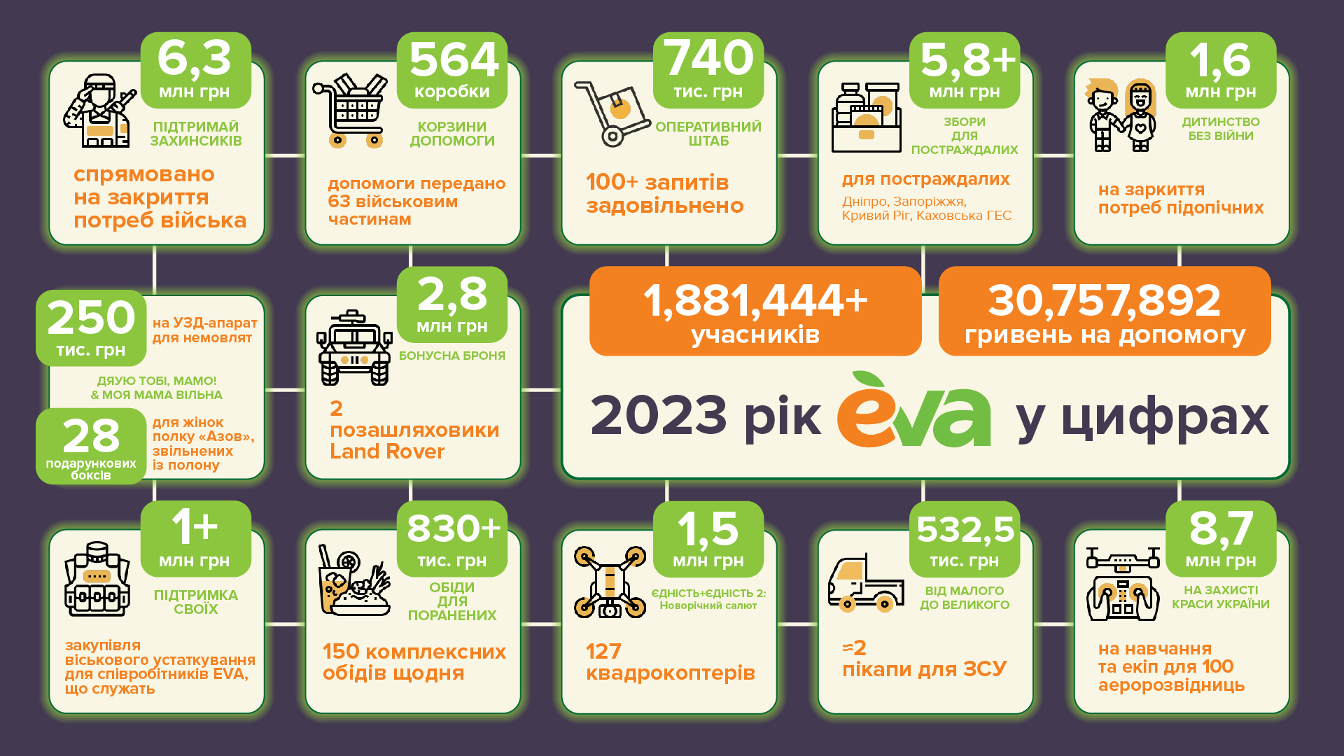 У 2023-му сума коштів, спрямованих за сприяння мережі EVA на підтримку обороноздатності України та допомогу постраждалим громадянам, склала понад 30 млн грн. Благодійні та соціальні проекти компанії за минулий рік підтримали близько 1,9 млн учасників.