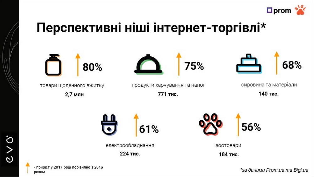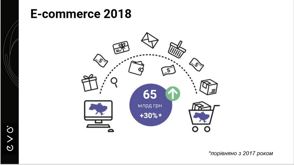 Згідно з підрахунками фахівців EVO, в минулому році вітчизняний сектор e-commerce виріс на 50% і досяг 39 млрд грн. На цей рік вони прогнозували зростання 30% і підсумковий товарообіг онлайн-торгівлі в 50 млрд грн. І, за даними EVO, ці показники до кінця року будуть досягнуті
