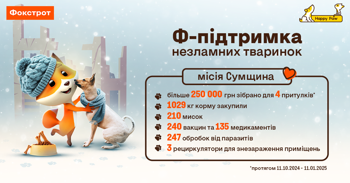 Після успішної допомоги притулкам врятованих тварин на Сумщині Фокстрот і Happy Paw виходять на фінальний етап благодійної ініціативи в ще одному прифронтовому регіоні. Проєкт вже підтримав понад 2750 тварин.