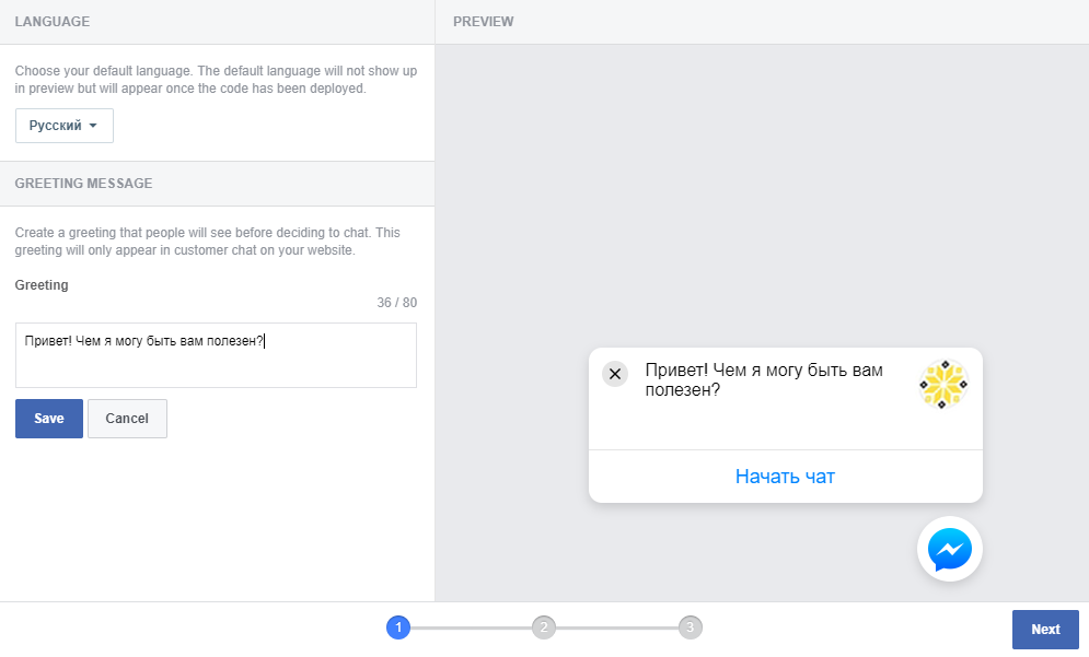 3. Запуститься покроковий діалог налаштування плагіна, де ви можете вибрати мову інтерфейсу, повідомлення-привітання, колір кнопки.
