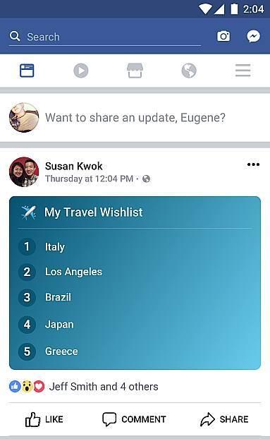 За допомогою “фічі” під назвою Lists (Списки) користувачі, а в подальшому і офіційні сторінки, зможуть створювати персоналізовані списки, які з’являться в меню поля для створення публікації. Особливого функціонального навантаження такі списки не несуть, але дозволять робити візуально контент сторінки більш різноманітним. Як це вигідно використовувати рітейлерам – вже завдання для онлайн-маркетологів. Нововведення вже стало доступно користувачам США та Австралії, на черзі інші країни.