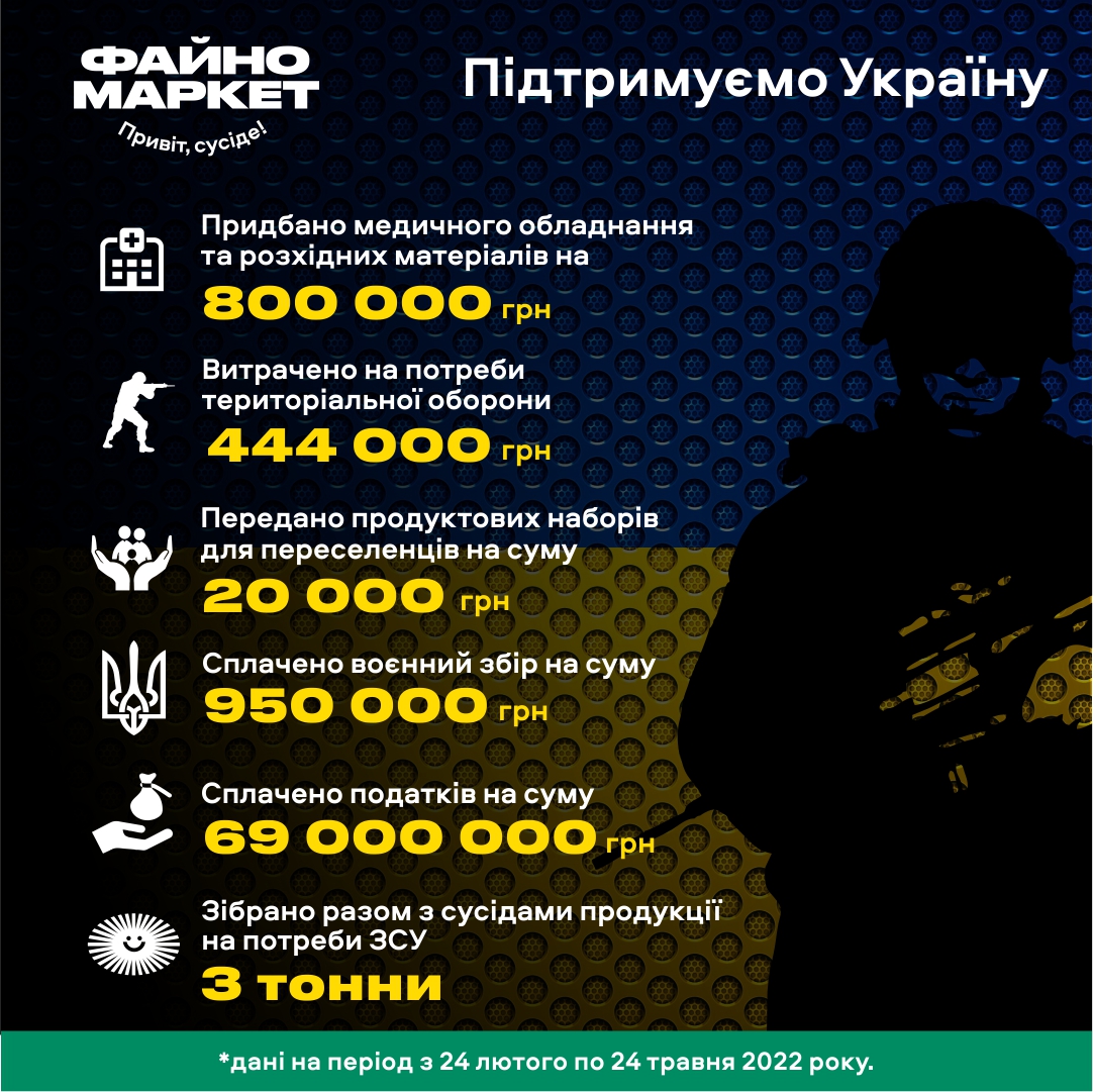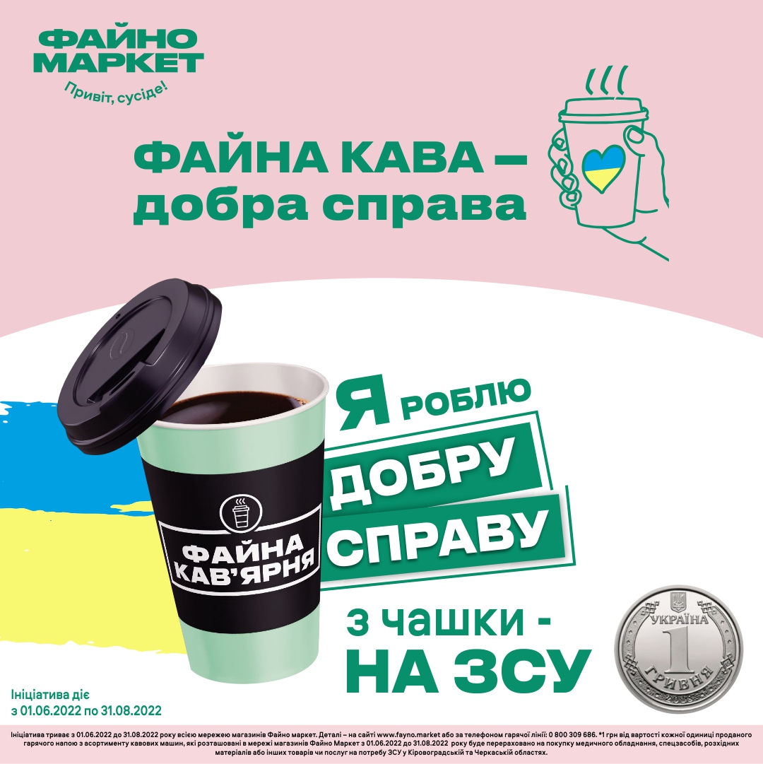 Крім допомоги медикам, мережа Файно Маркет надає підтримку військовим. Уже на даний момент закупили чотири позашляховика та започатковують новий соціальний проект «Файна кава = добра справа!». З 1 червня 2022 року з кожної проданої чашки кави мережа відраховуватиме 1 грн на покупку медичного обладнання або інших потреб ЗСУ. Ініціатива триватиме до 31.08.2022 року.