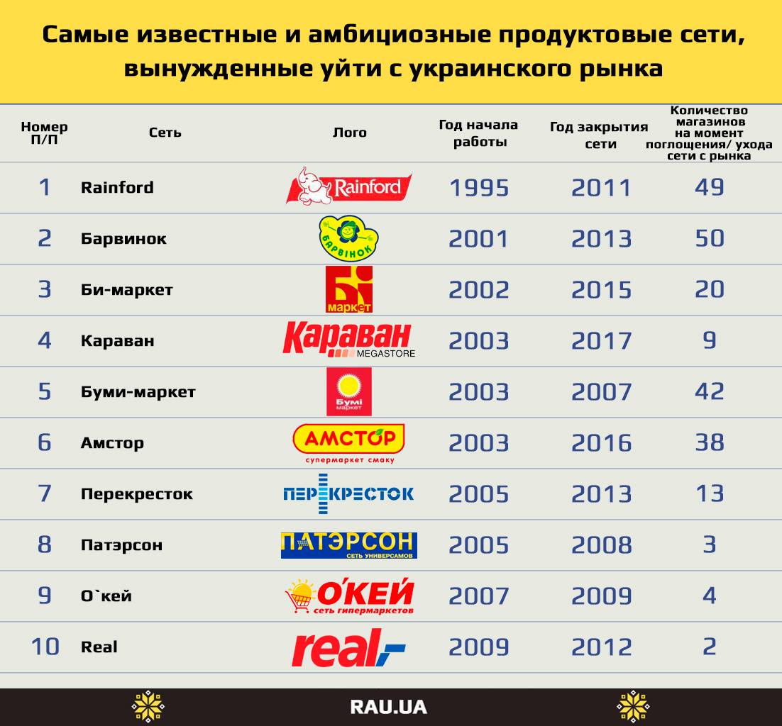 Є приклади і вітчизняних FMCG-мереж, «які не дожили» до наших днів. Один з найвідоміших – перша роздрібна мережа України Rainford, на піку розвитку налічувала 49 магазинів. У 2011 році через високе боргове навантаження компанія збанкрутувала.